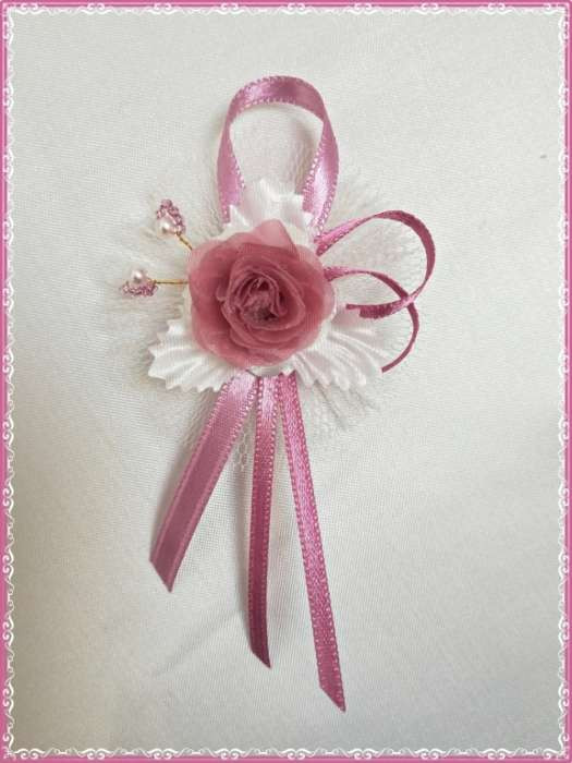 1" Kitűző, bokréta ekrü-mályva 217. Más szín-díszítésben is kérhető az esküvőd színeihez igazodva! Mérete: 6 cm-es tüllre épített virágdísz, amiből a szalagok kb. 8-9 cm-re nyúlnak ki.