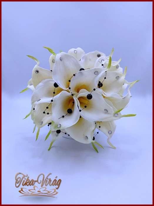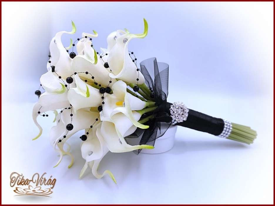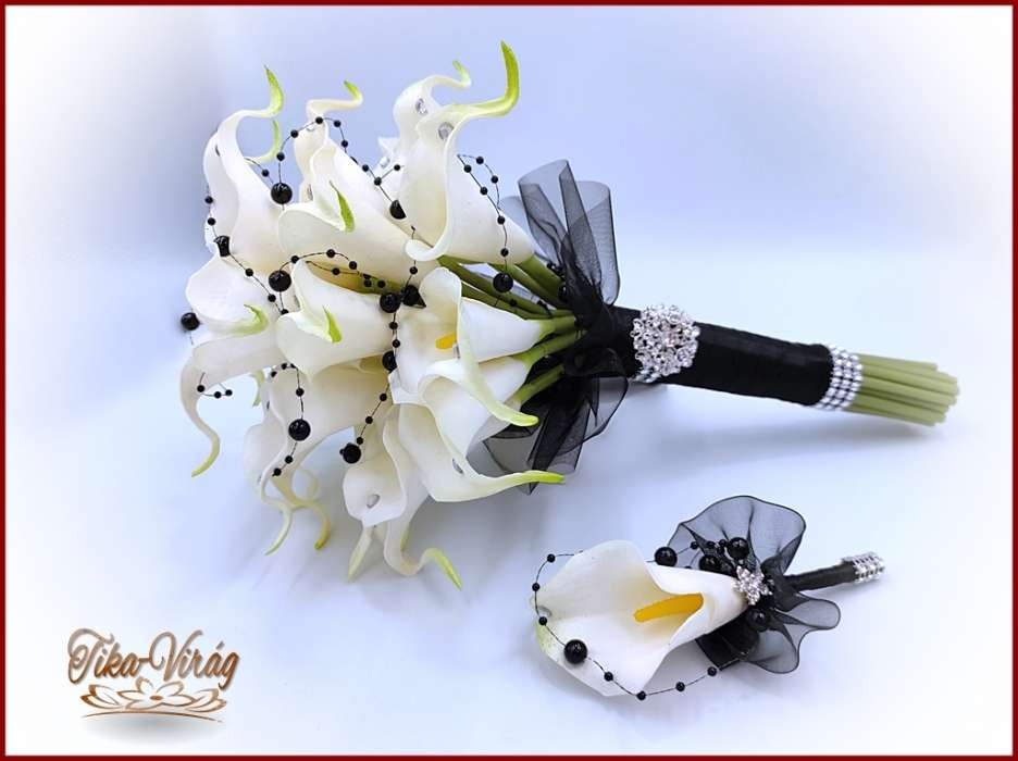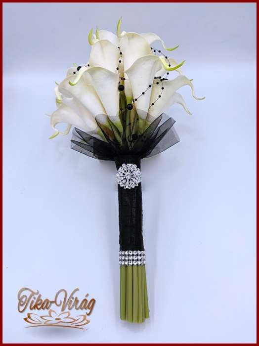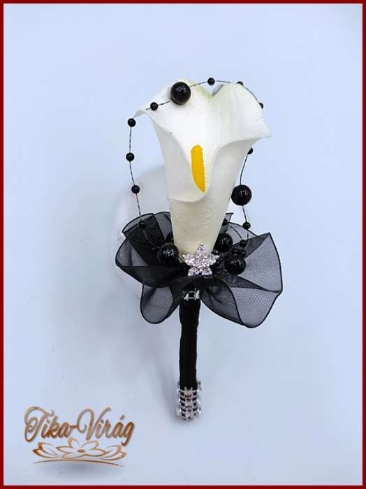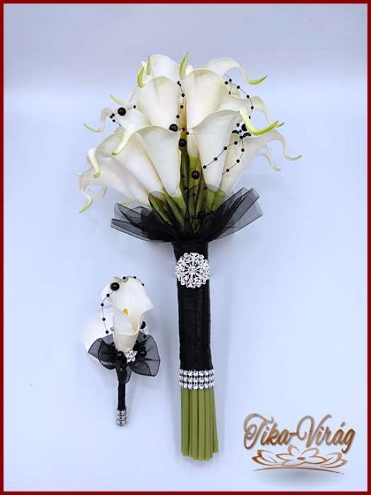 24 virágos Fehér Kála örök-csokor fekete díszítéssel + kitűzővel 195522.
