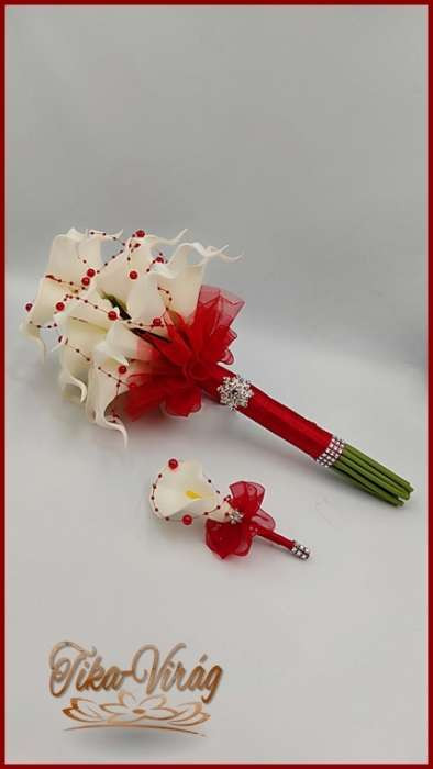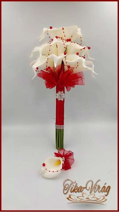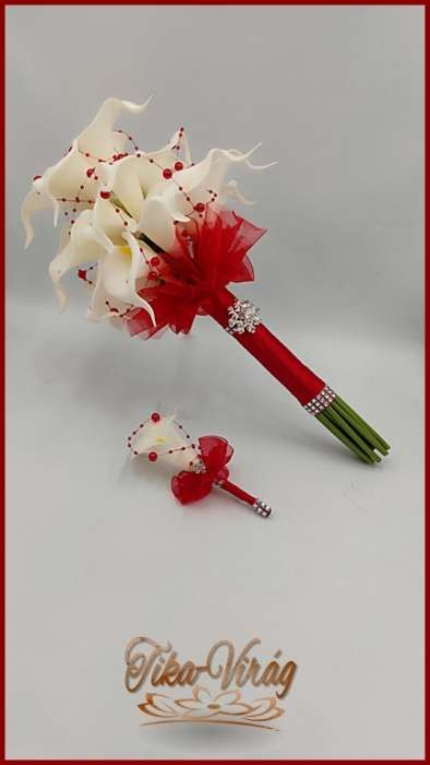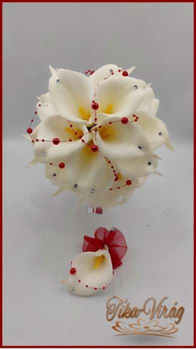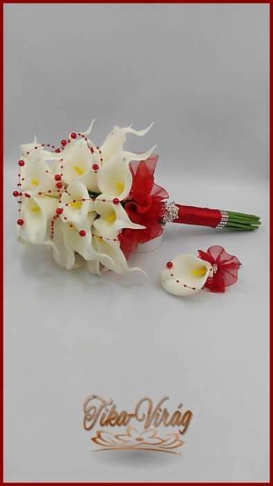 24 virágos Fehér Kála örök-csokor piros díszítéssel + kitűzővel 093339.