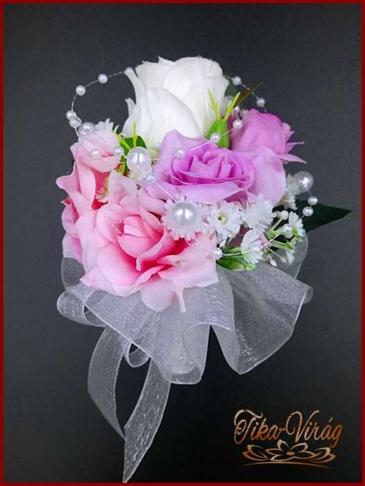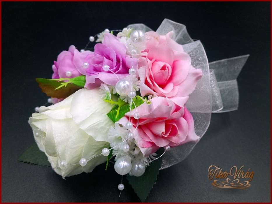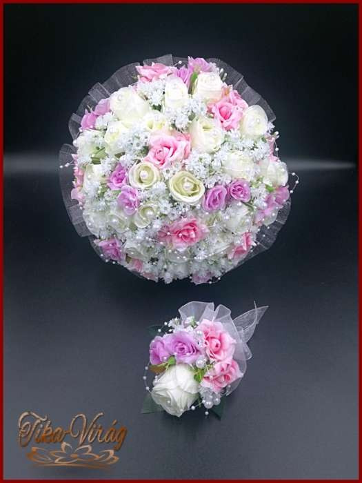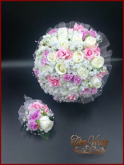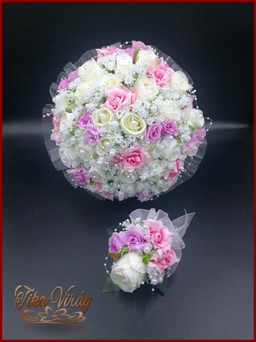 25 SZÁLAS FEHÉR RÓZSÁS-LILA-RÓZSASZÍN RÓZSÁVAL DÍSZÍTETT ÖRÖK-CSOKOR+kitűzővel 131919_1.