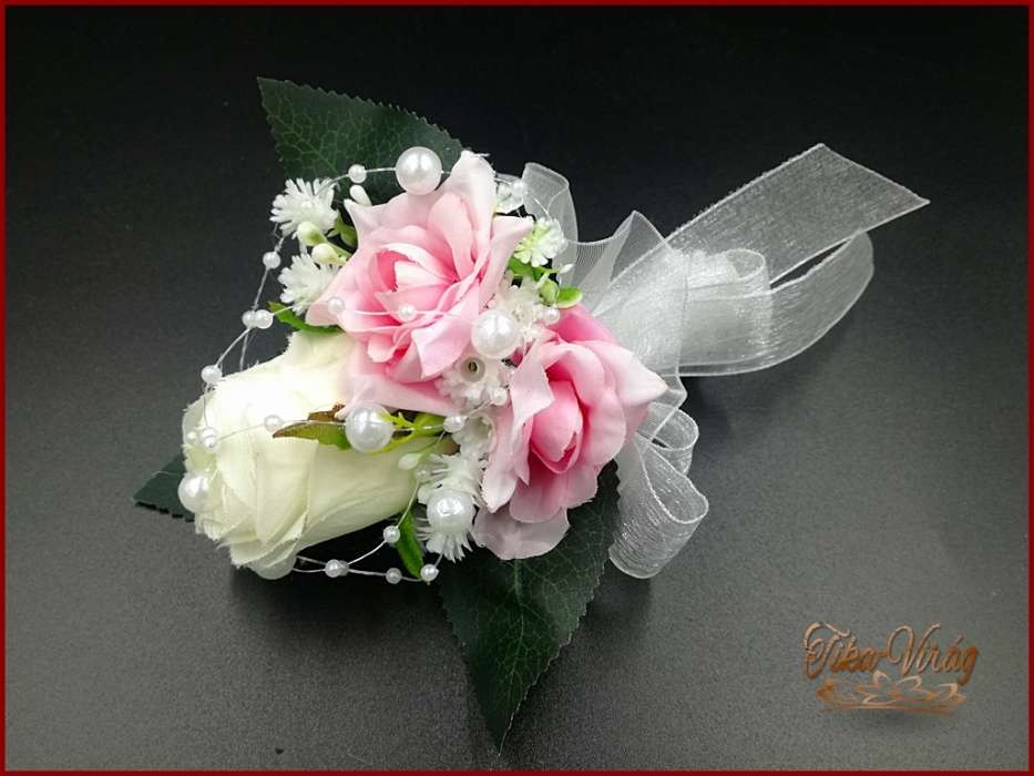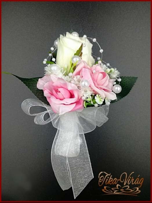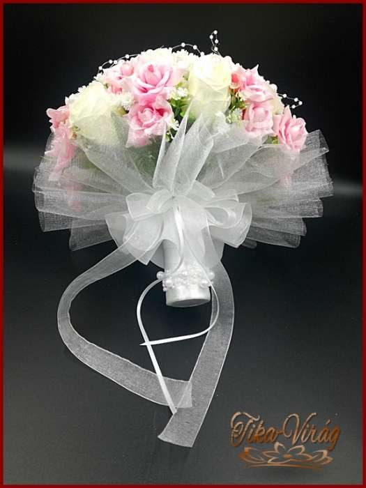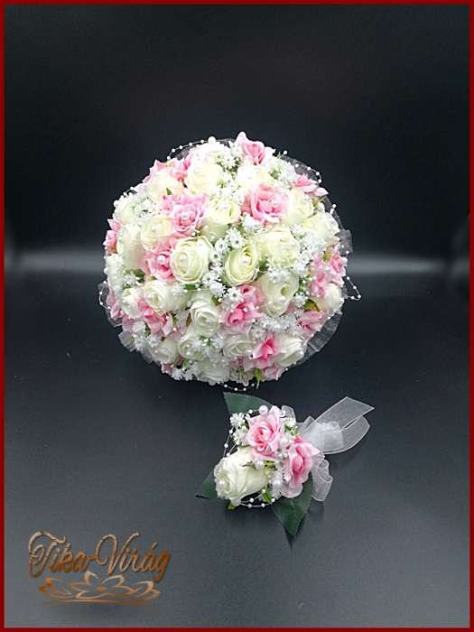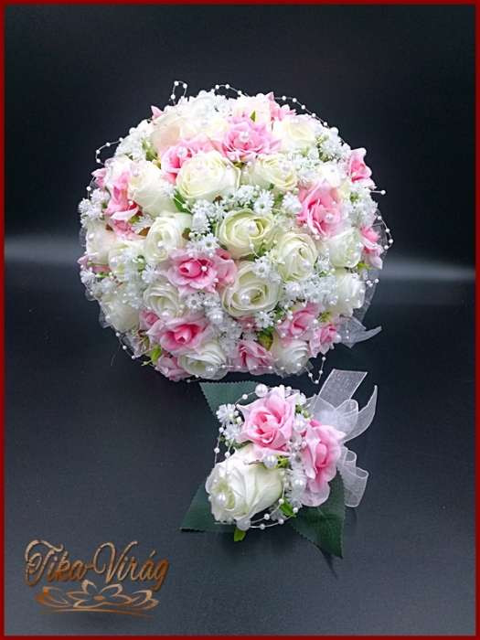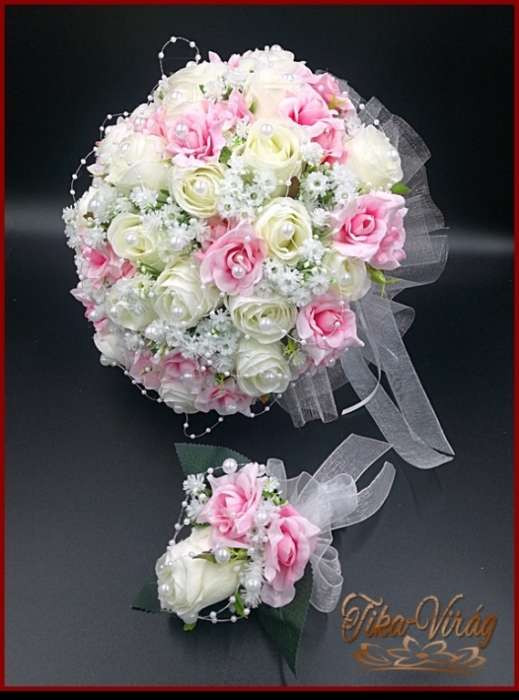 25 SZÁLAS FEHÉR RÓZSÁS-RÓZSASZÍN RÓZSÁVAL DÍSZÍTETT ÖRÖK-CSOKOR + kitűzővel 092930.