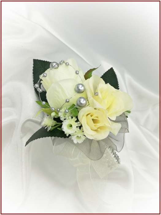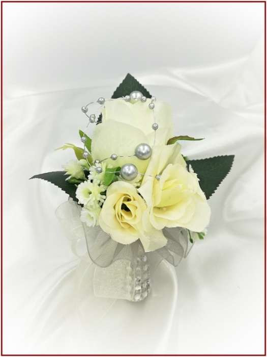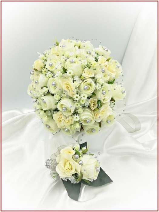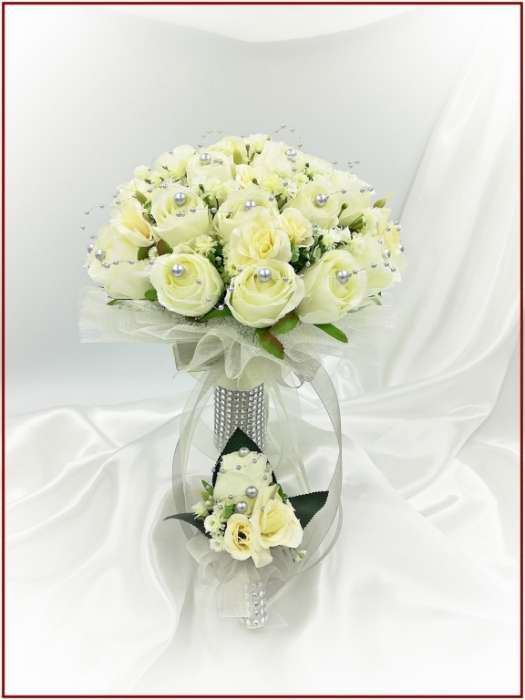 25 szálas ekrü rózsa örök-csokor ezüst díszítéssel + kitűzővel 220645.