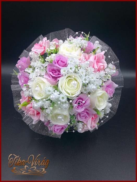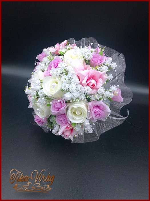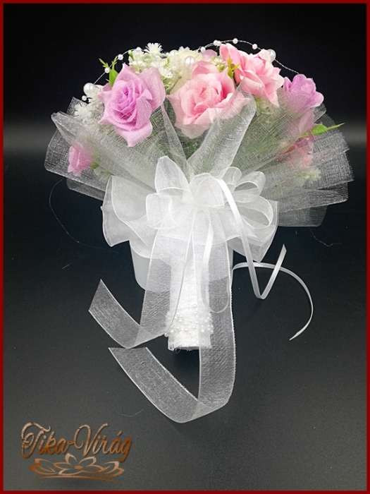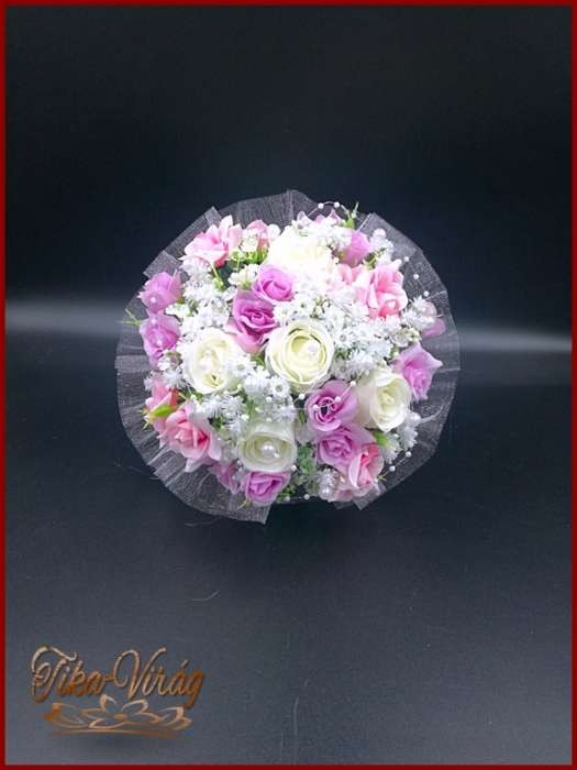 5 SZÁLAS FEHÉR RÓZSÁS-LILA-RÓZSASZÍN RÓZSÁVAL DÍSZÍTETT ÖRÖK-CSOKOR 132424.