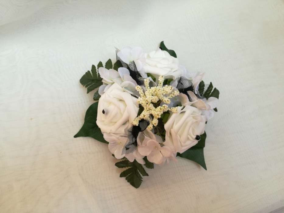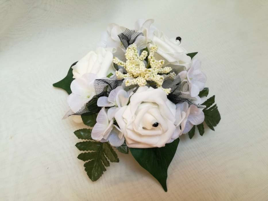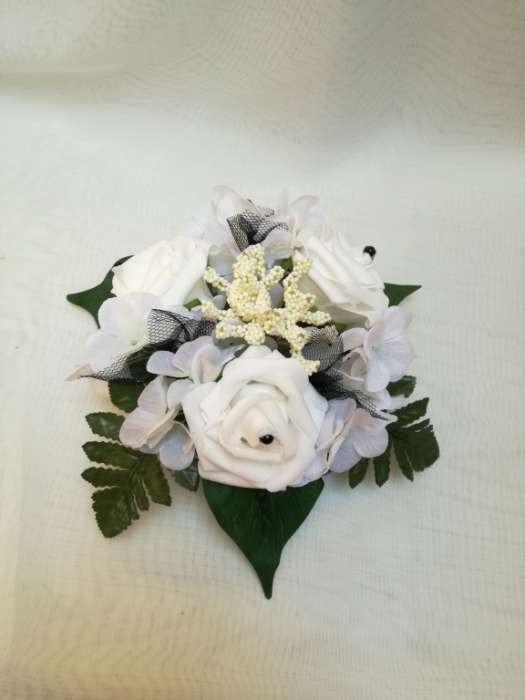 Asztaldísz fehér rózsás-fekete díszítéssel 170453. 3 virágos Asztaldísz méretei: hossza: 22 cm szélessége: 22 cm magassága: 11 cm Más színben, szín-díszítéssel is kérhető!