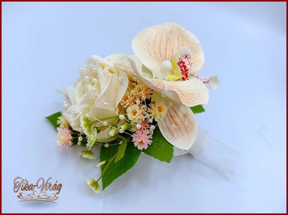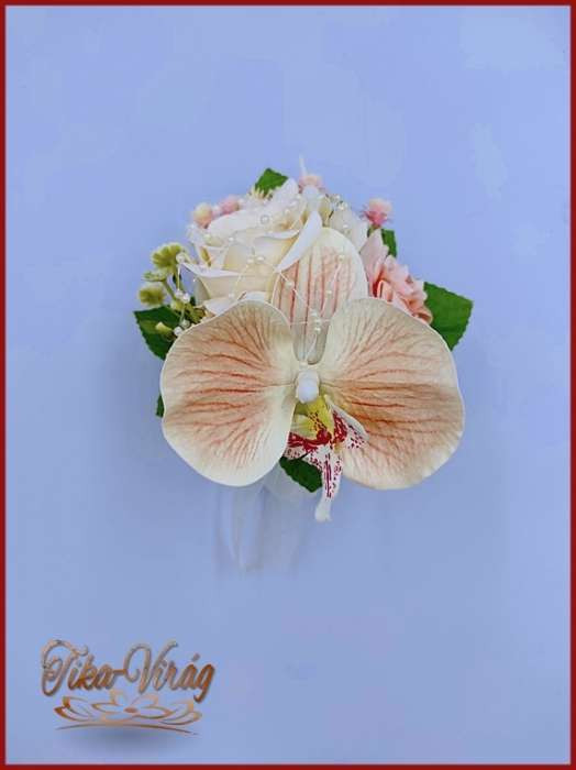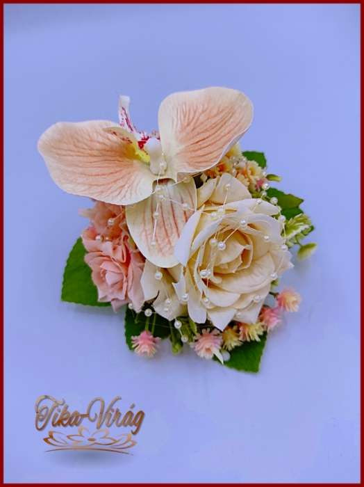 Barack-krém orchideás-rózsa kitűző, bokréta
