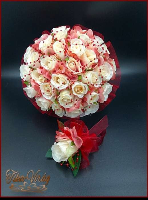 Burgundi díszítésű pasztell-mályvás 34 virágos örök-csokor+kitűzővel 195033.