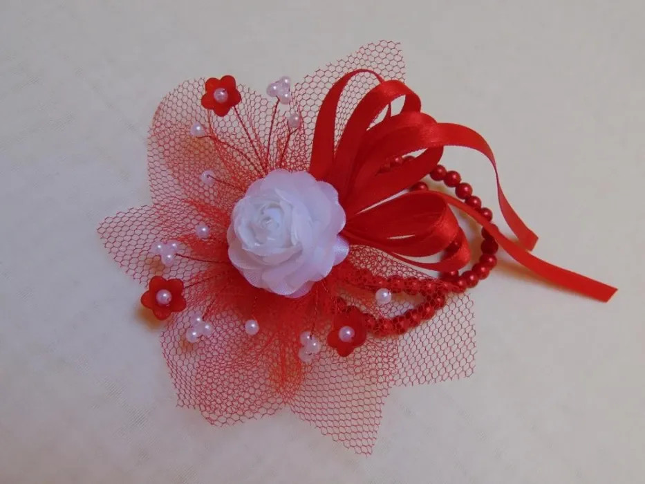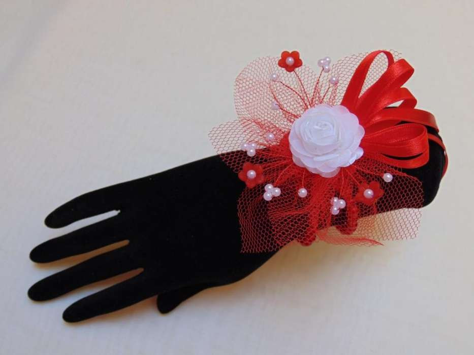 Csuklódísz piros-fehér gyöngysoros pánttal