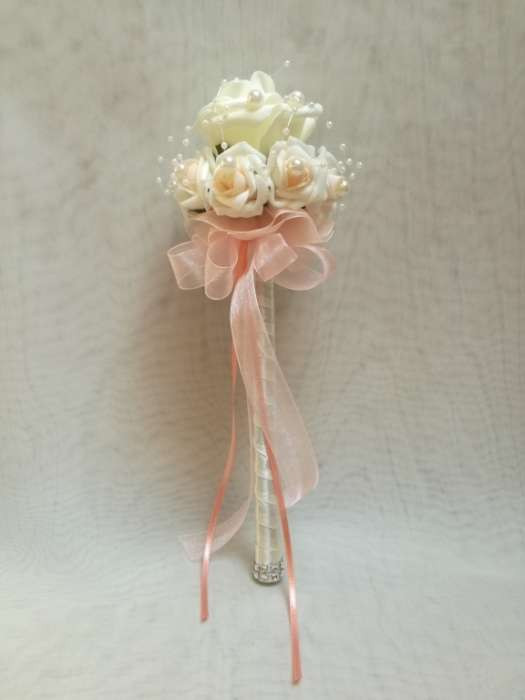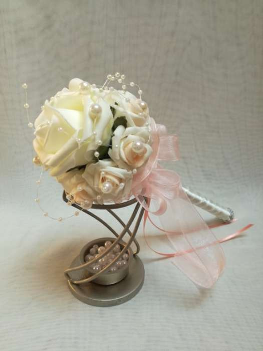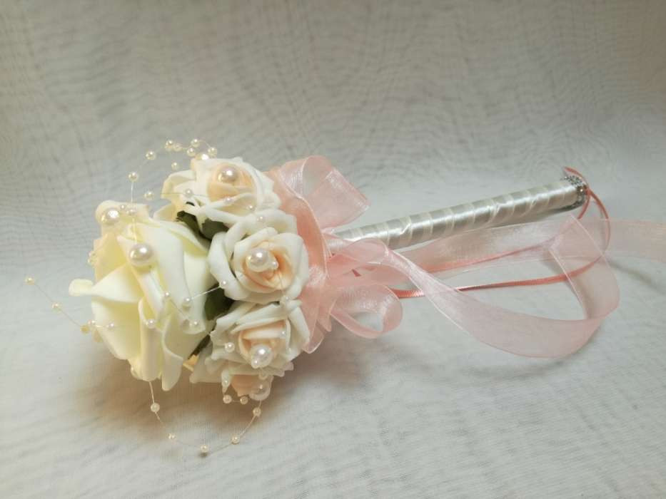 Ekrü-barack dobó, koszorúslány vagy köszöntő örök-csokor 154056. Csokor hossza: 25cm átmérője: 12cm fej magassága: 8cm Más szín-összeállításban is kérhető!