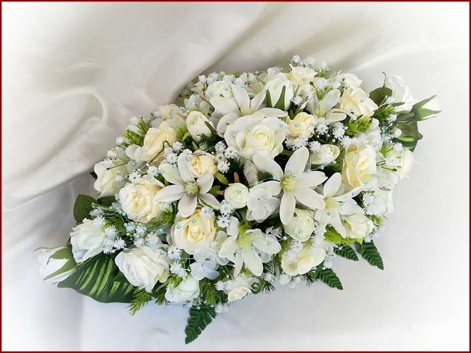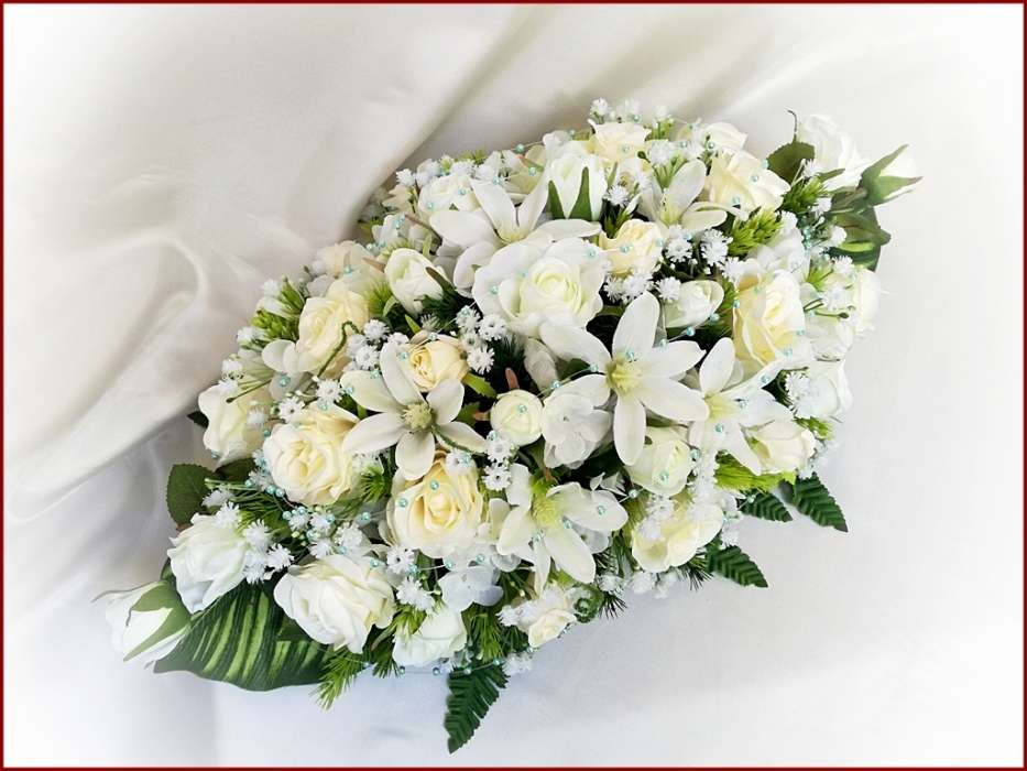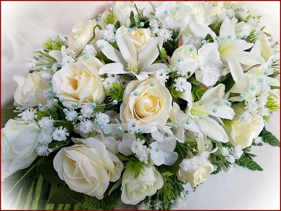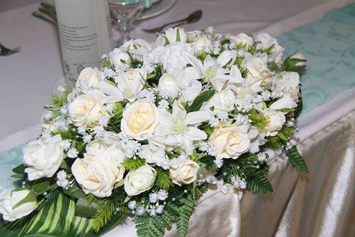 Ekrü-fehér türkiz díszítésű asztaldísz 114621_1. 31 szál rózsából és iszalaggal díszítve. Asztaldísz méretei: hossza: 60cm szélessége: 30cm magassága: 20cm Más színben is kérhető!