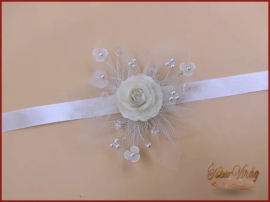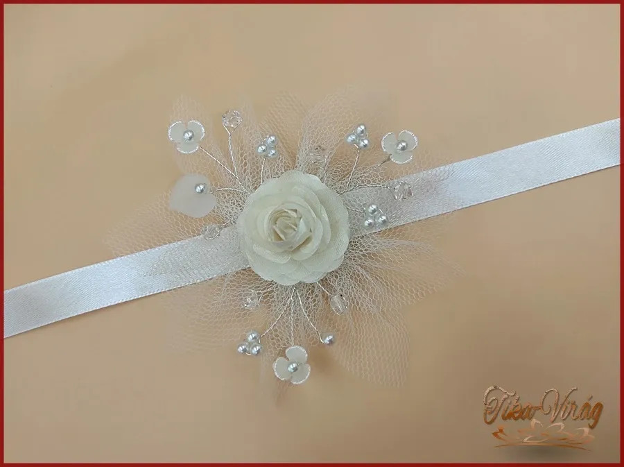 Ez az ekrü színű csuklódísz tökéletes választás, ha stílusos kiegészítőt keresel különleges alkalmakra. A közepén található rózsa finom, nőies megjelenést kölcsönöz, míg a fehér gyöngyök és az áttetsző tüll elegáns összhatást biztosítanak. A szalag kényelmes viseletet nyújt, így egész nap komfortosan hordható.