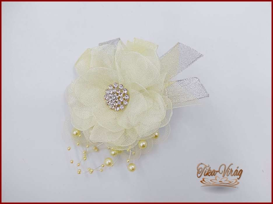 Mérete: 10x10cm Látványos, nagy csuklódísz, ami strasszal, gyönggyel, egy kis ezüst szalaggal díszített.