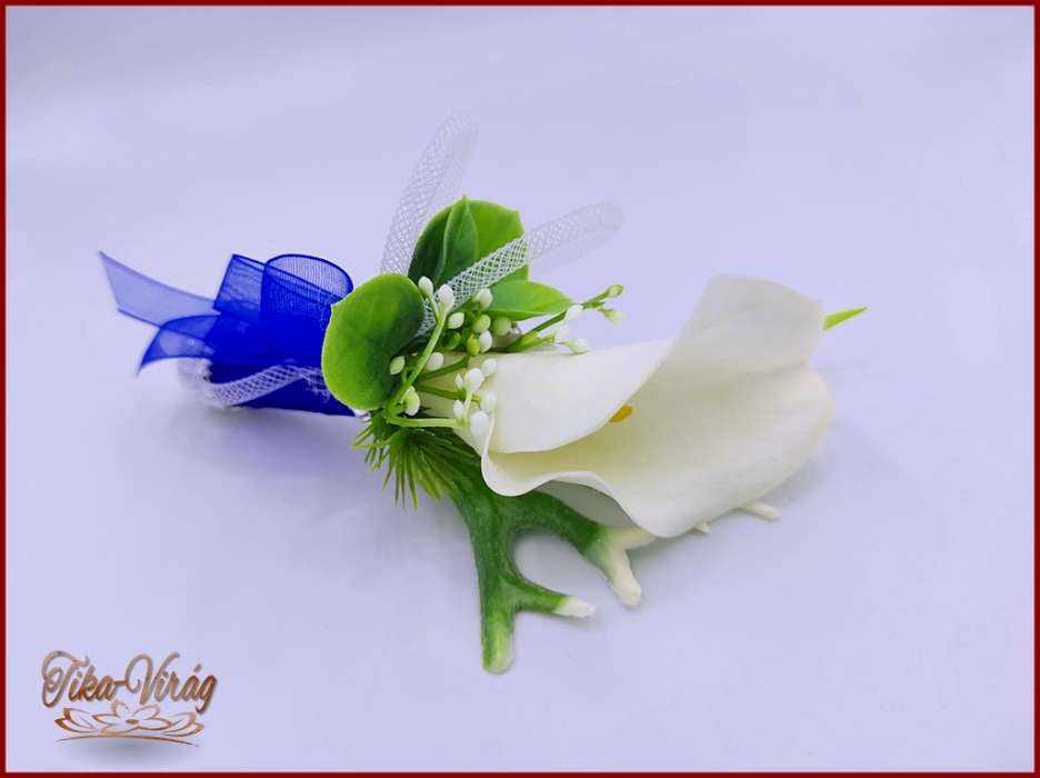Fehér Kála kitűző, bokréta királykék díszítéssel