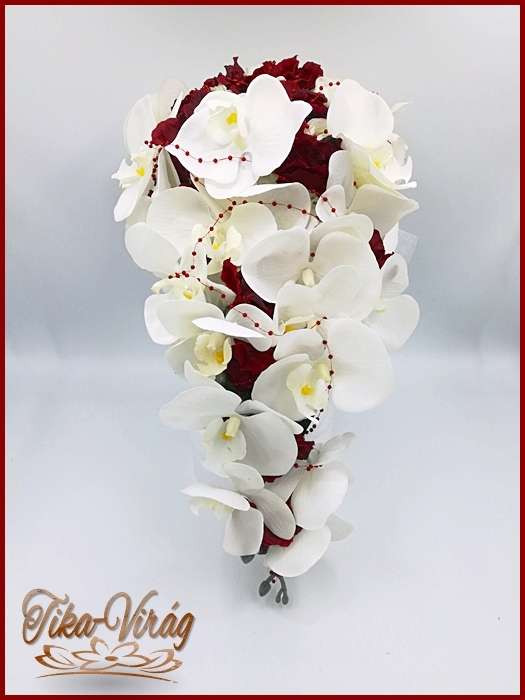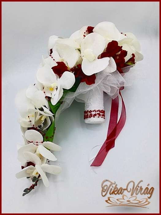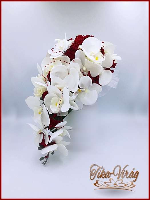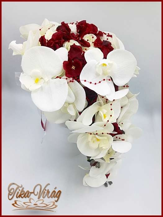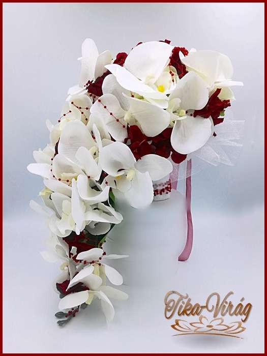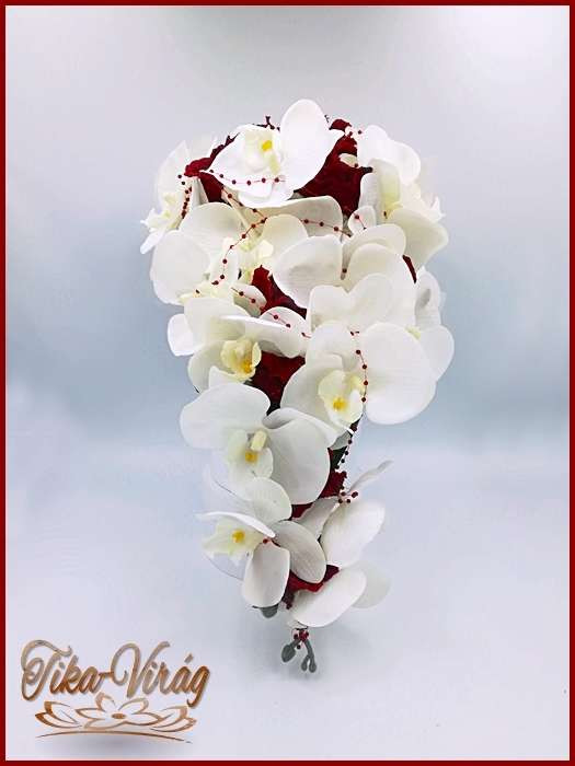 Fehér-bordó örök-cseppcsokor 165336_1. 24 szál fehér rózsából fehér orchideával és bordó hortenziával díszített örök-csokor