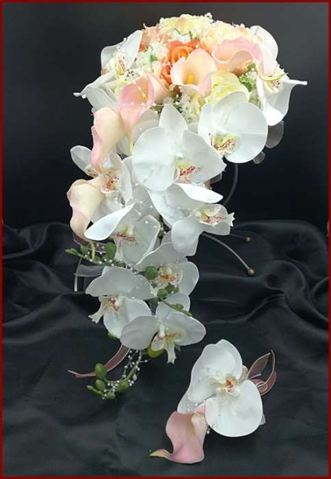 Fehér orchideás-rózsaszín kálás-narancs-barack rózsás örök-csokor kitűzővel 233656.