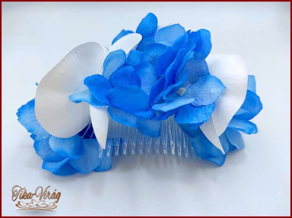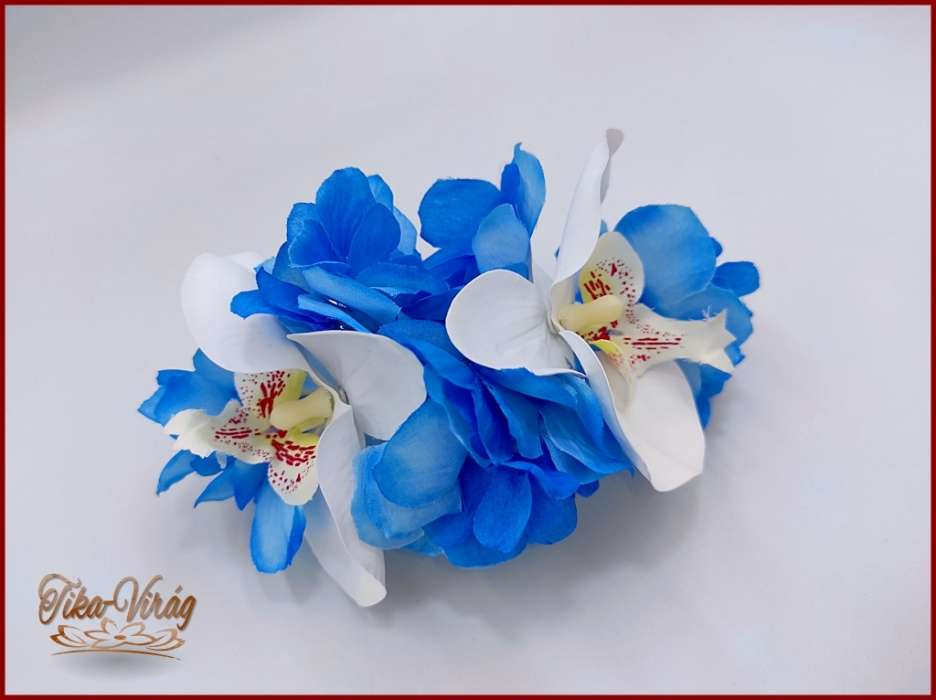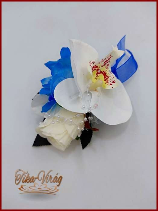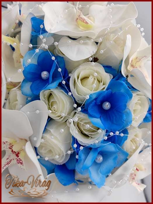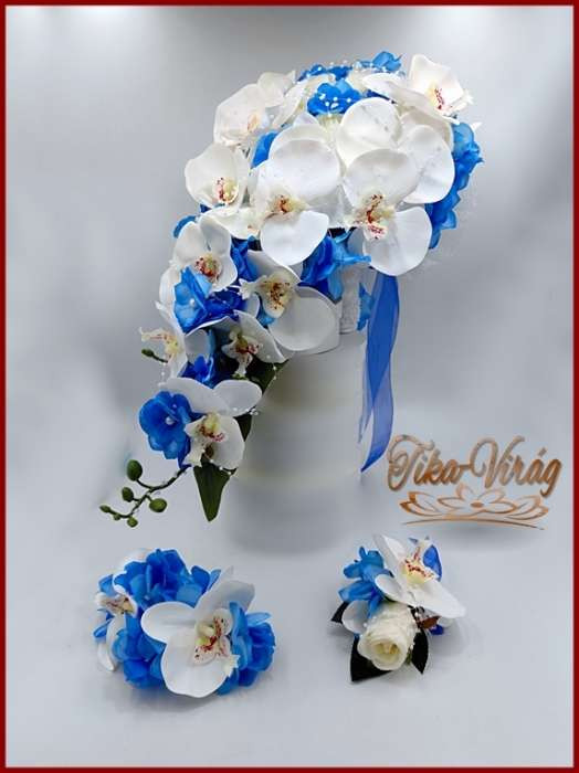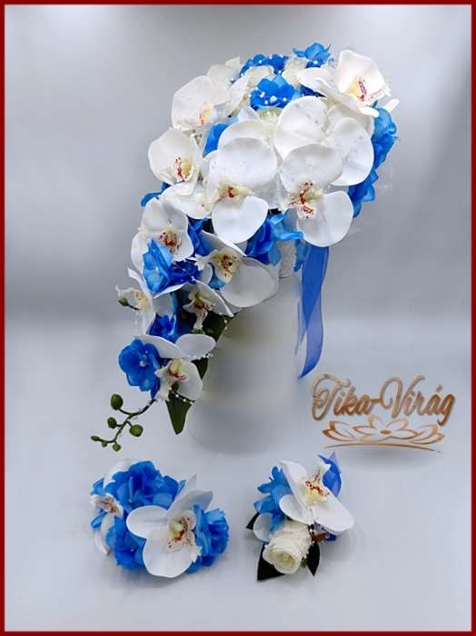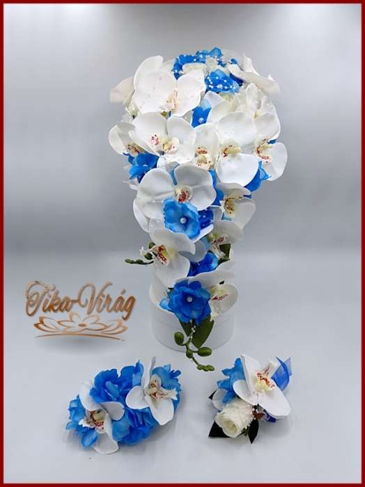 Fehér rózsás- Fehér orchideás király-kék hortenziával díszített örök-csepp csokor + kitűzővel + hajdísszel 120005.