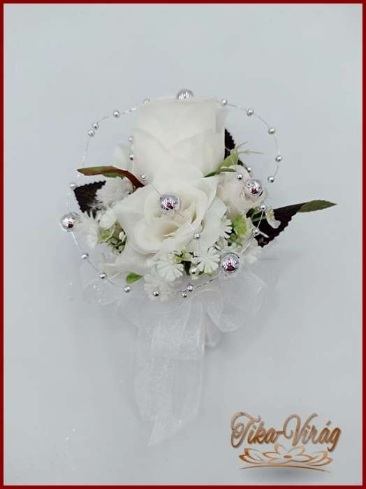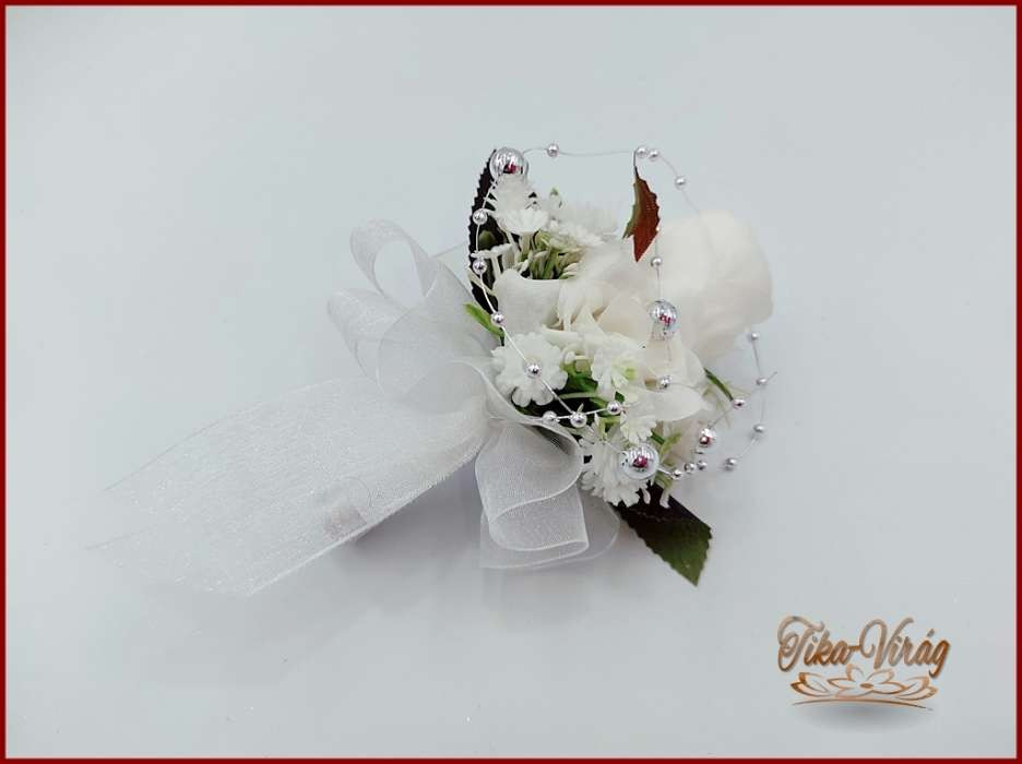 Fehér rózsás-ezüst díszítésű kitűző, bokréta