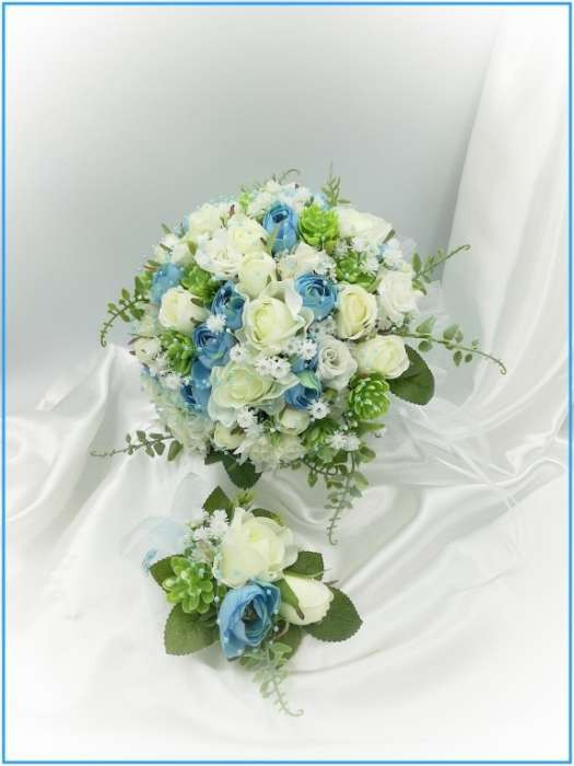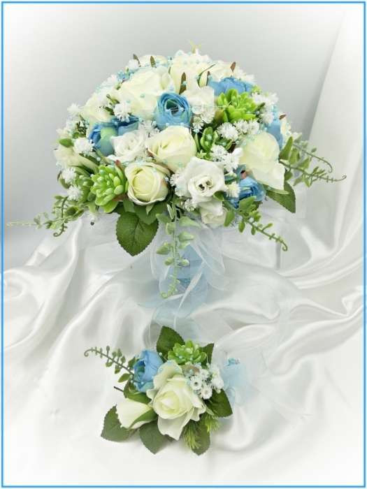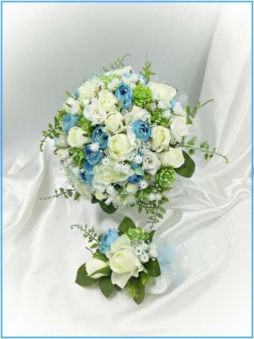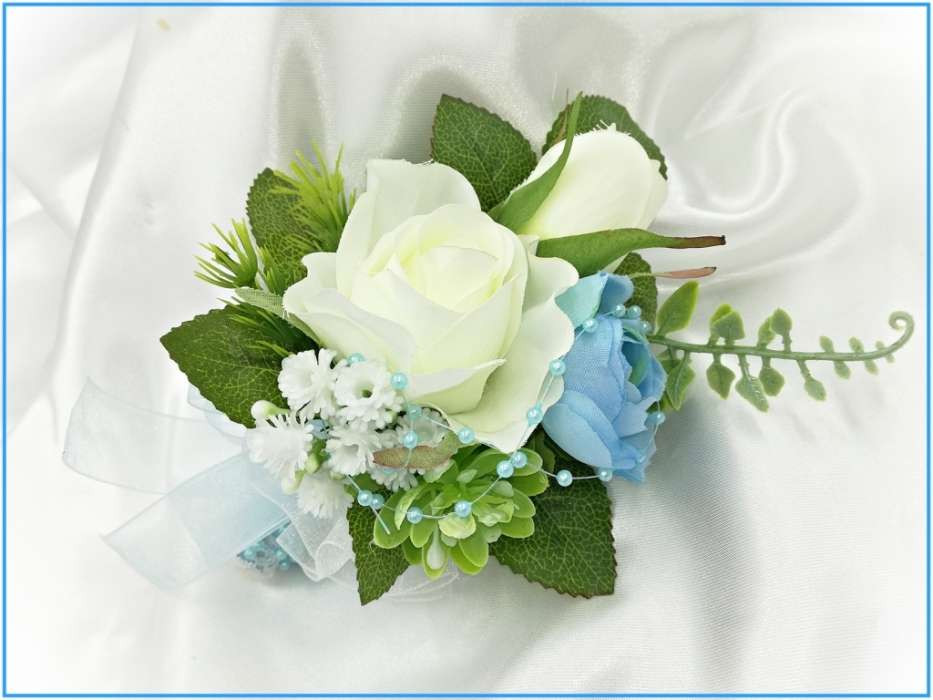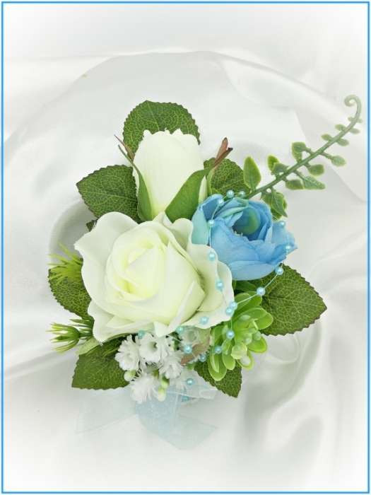 Fehér rózsás-kék boglárkás örök-csokor + kitűzővel 224357.