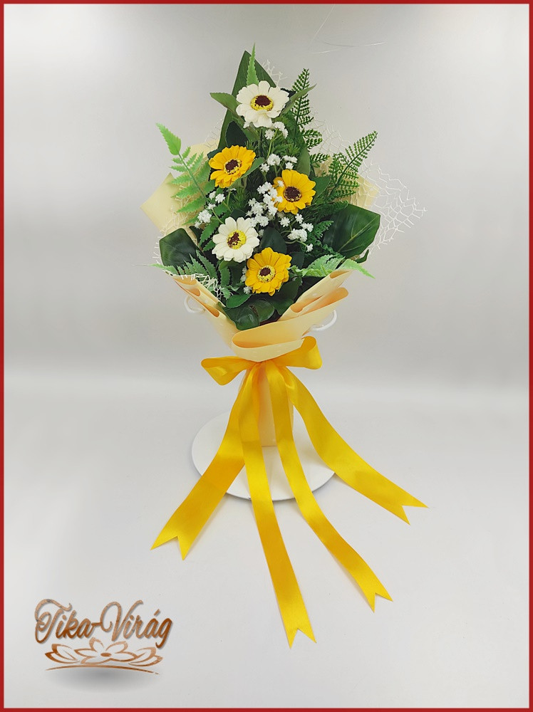 3 szál napsárga és 2 szál ekrü színű gerberából álló szappanvirág csokor.