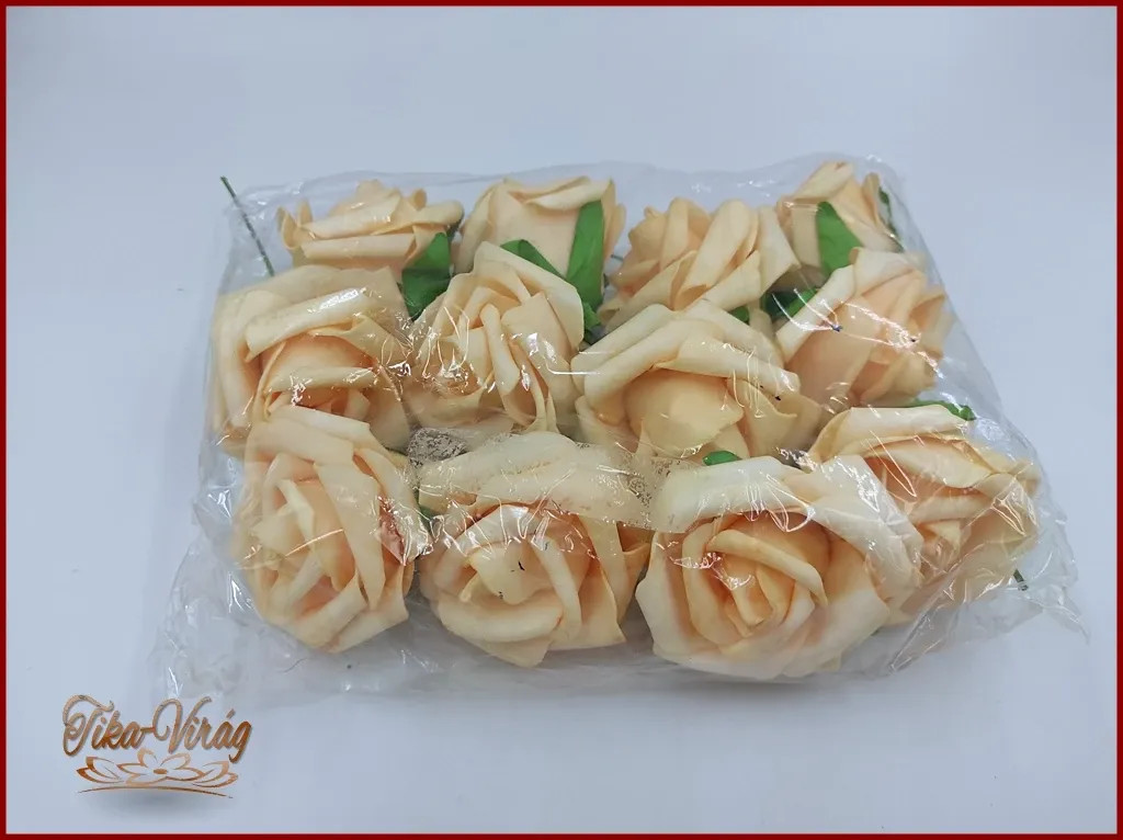 Habrózsák vagy polifon rózsák barackos 140436. Méretük 7-8 cm 1 csomagban 12db virág van. Az ár a csomagra értendő.