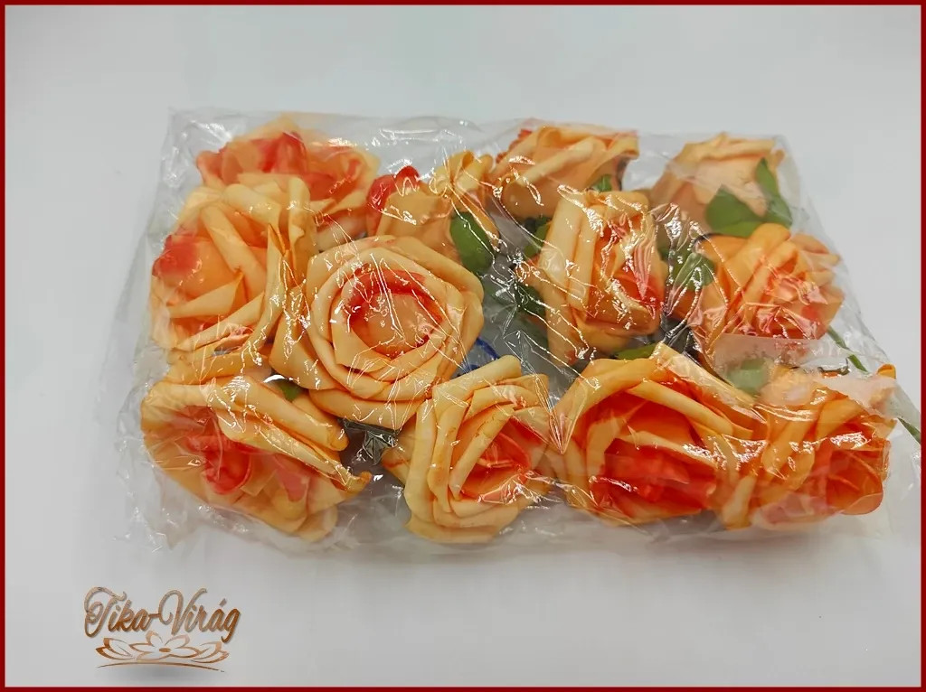 Habrózsák vagy polifon rózsák sötét narancs közepű 140418. Méretük 7-8 cm 1 csomagban 12db virág van. Az ár a csomagra értendő.