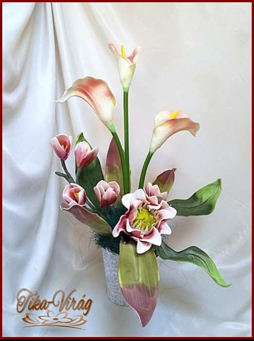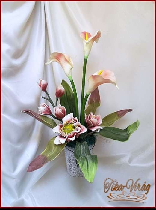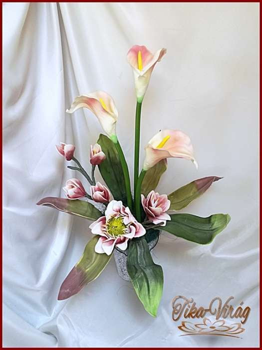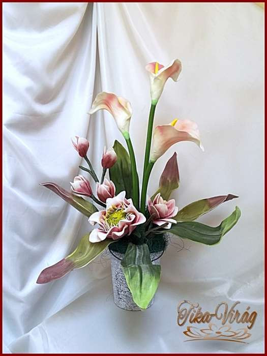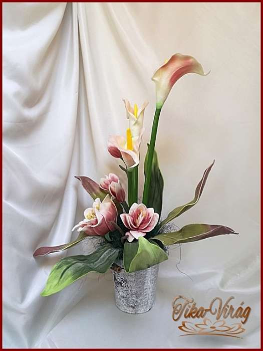 Kálás-magnóliás ikebana vödörben 124624_1. Prémium minőségű gumi hatású virágokból áll. Mérete: magassága: 60cm szélessége: 50cm Más színben is kérhető előre megbeszélés alapján!