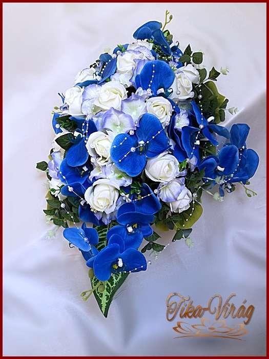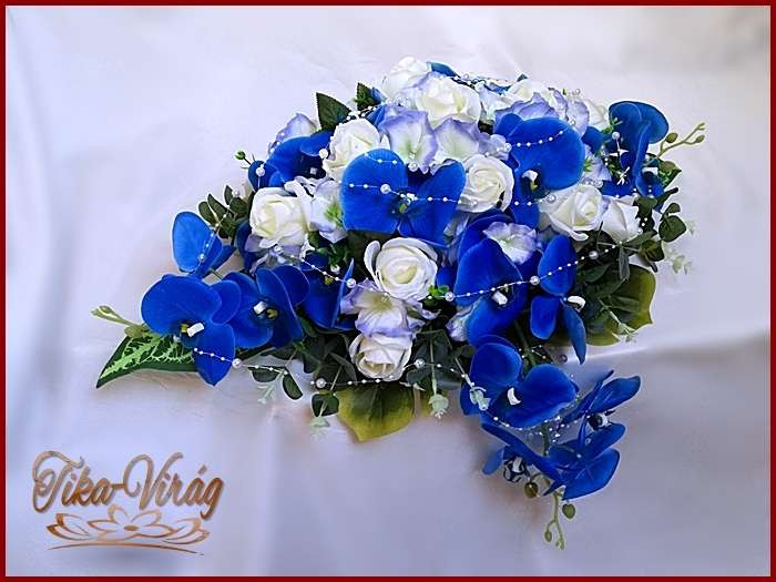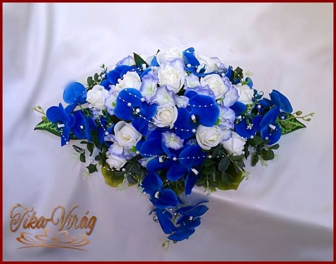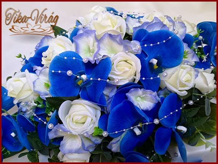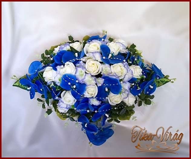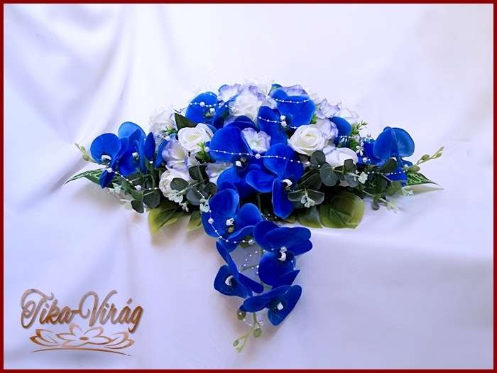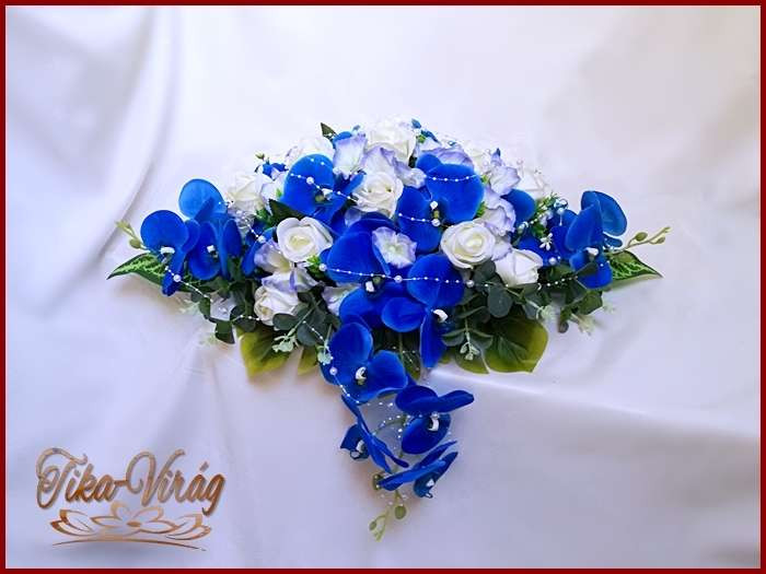 Kék-orchideás- fehér rózsákkal örök-asztaldísz 192358.