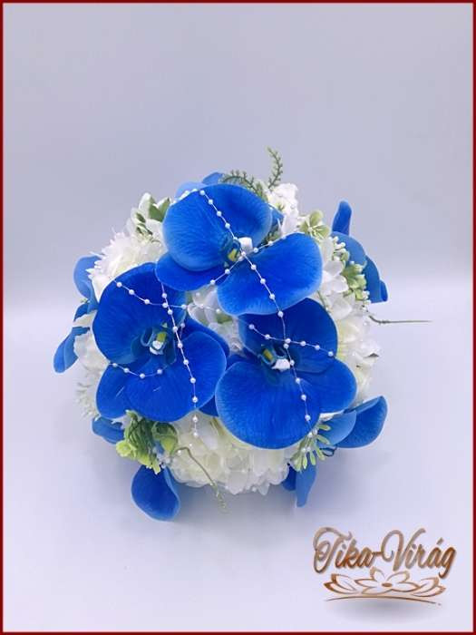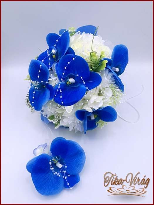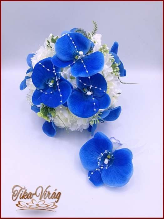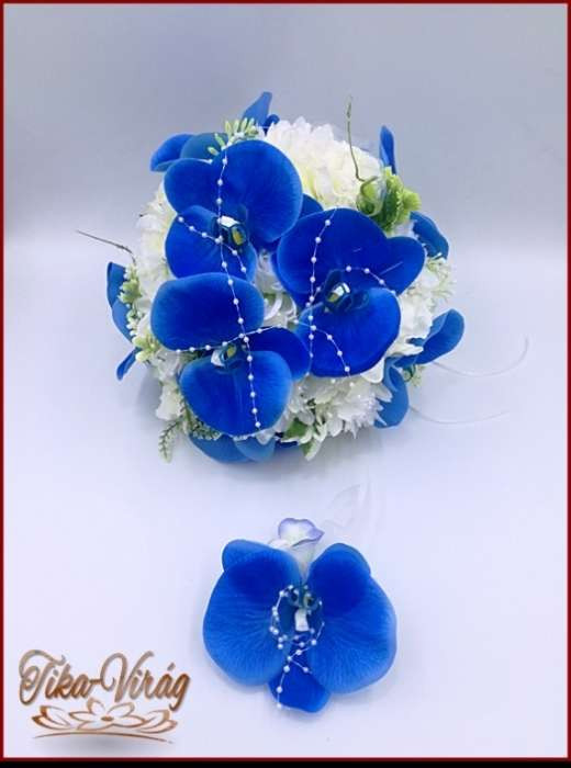 Kék orchideás-fehér rózsával, dália, iszalaggal díszített örök-csokor+kitűzővel 235902.