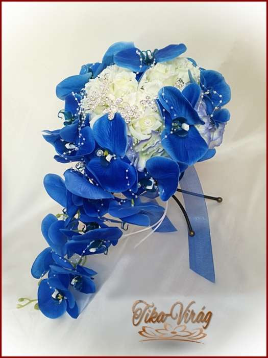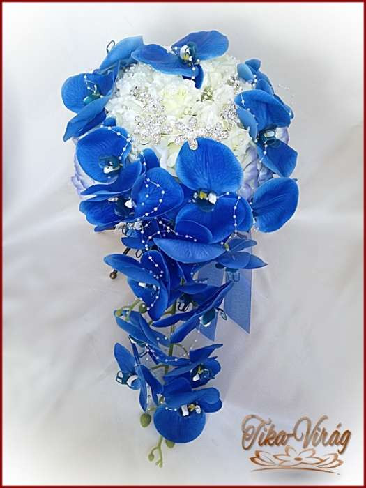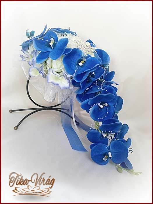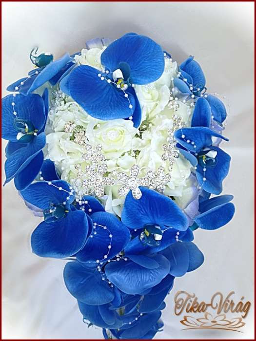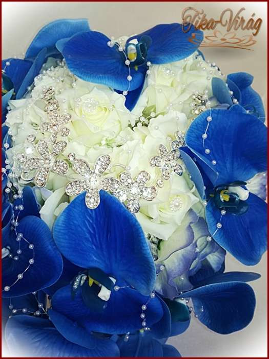 Prémium minőségű virágokból készült örök-csokor! Kék-orchidea, 11 szál fehér rózsa, fehér és kék hortenziával díszítve. Strasszos virágdísszel és gyönggyel!