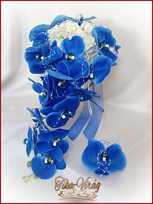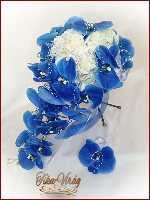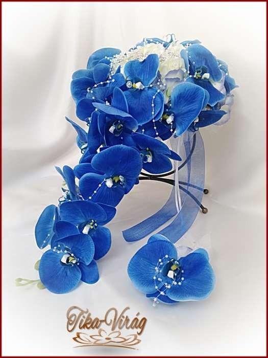 Kék orchideás örök-csepp-csokor+kitűzővel 122010.