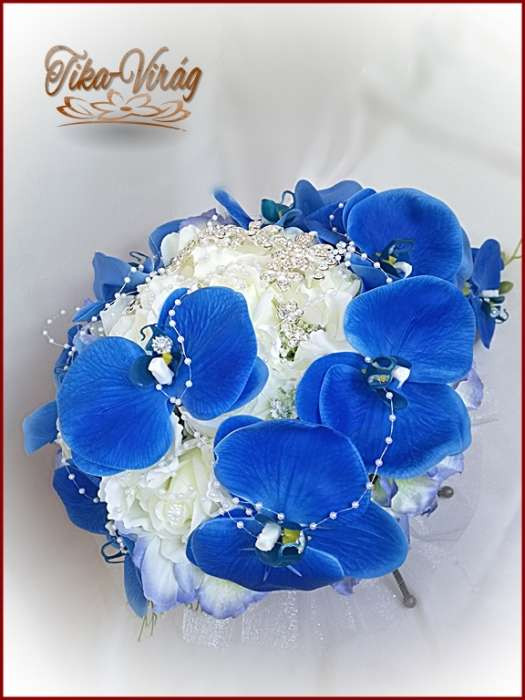 Prémium minőségű virágokból készült örök-csokor! Kék-orchidea, 11 szál fehér rózsa, fehér és kék hortenziával díszítve. Strasszos virágdísszel és gyönggyel!