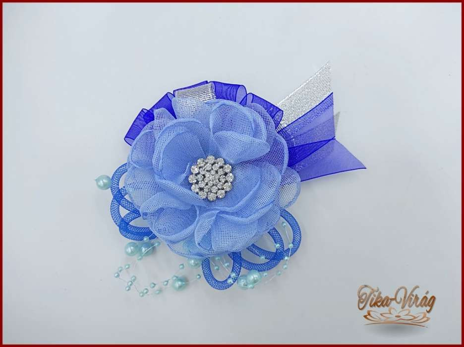 Látványos, nagy csuklódísz, ami strasszal, gyönggyel, egy kis ezüst szalaggal díszített.