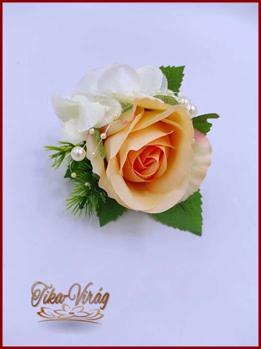 Ez a stílusos kitűző a barack rózsák és ekrü hortenzia elegáns kombinációjával készült, mely a legszebb kiegészítő lehet esküvői vagy más ünnepi alkalmakra. A prémium minőségű mesterséges virágokból készült kitűző nem hervad el, így hosszú éveken át megőrzi szépségét. A színválasztás és a virágok finom elrendezése lehetővé teszi, hogy bármely esküvői vagy különleges esemény ruhájához illeszkedjen. Ideális koszorúslányoknak, vagy mint kiegészítő esküvői ruhákhoz.