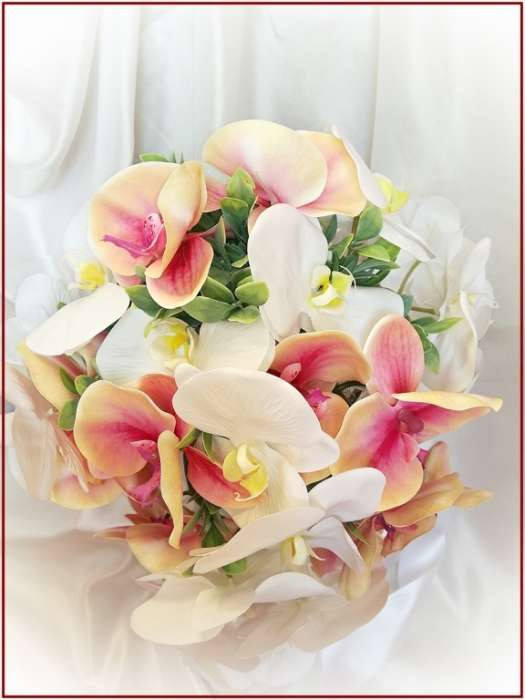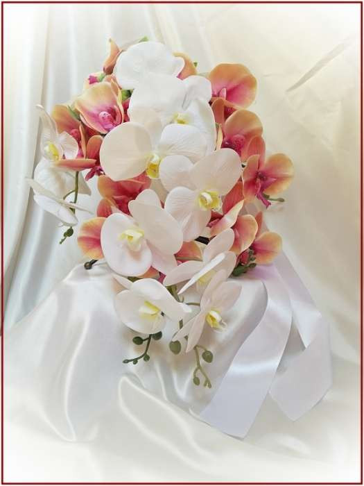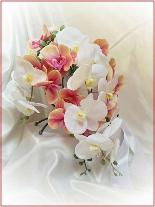 Korall-fehér orchideás örök-csokor 164027_1. Mérete: 50cm hosszú , 40 cm széles Más színben is kérhető! Prémium minőségű virágokból készült örök-csokor!