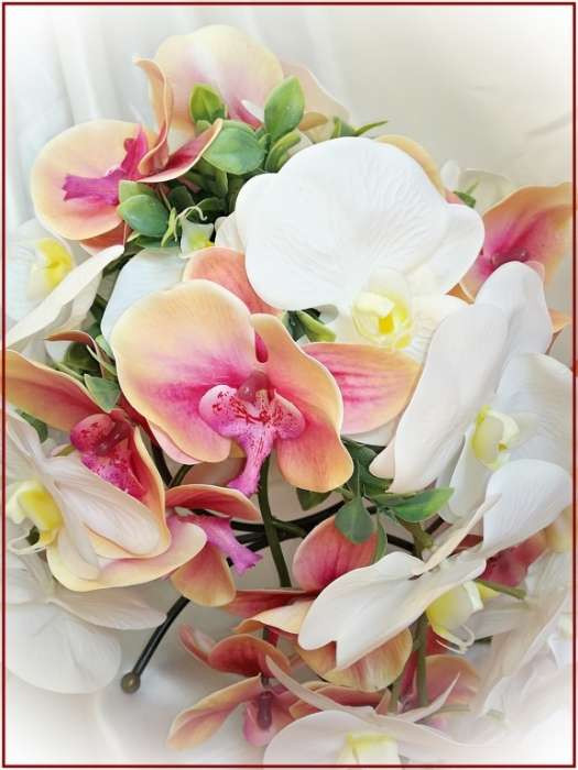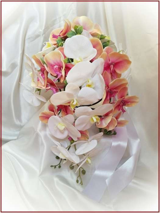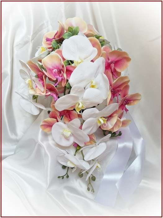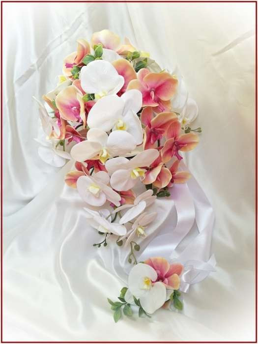 Korall-fehér orchideás örök-csokor kitűzővel 164824. Mérete: 50cm hosszú , 40 cm széles Más színben is kérhető! Prémium minőségű virágokból készült örök-csokor!