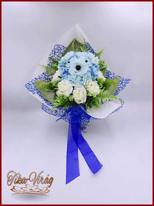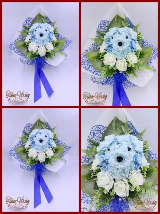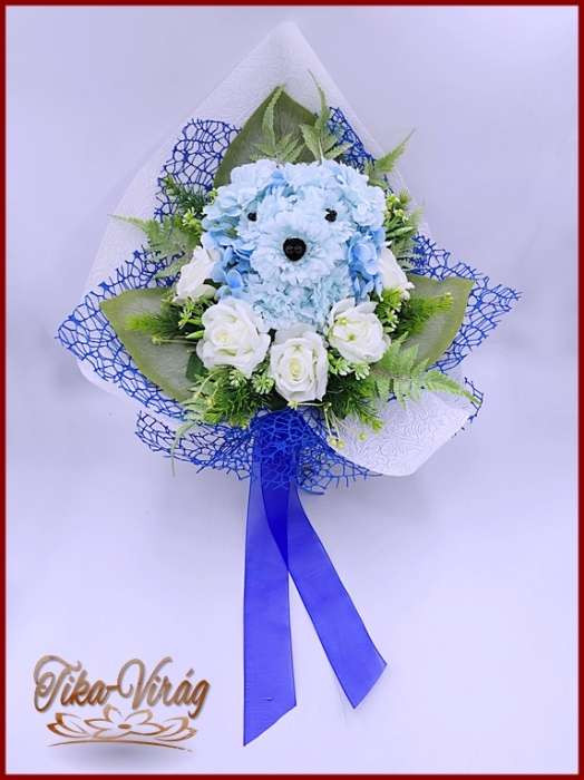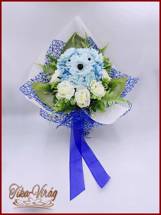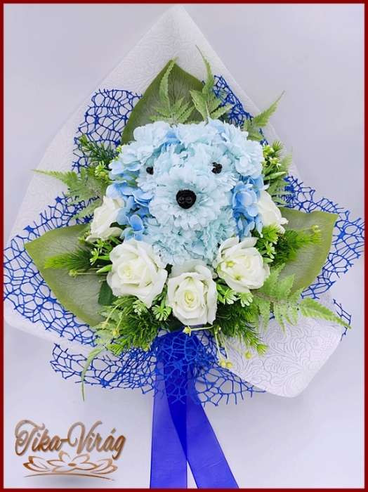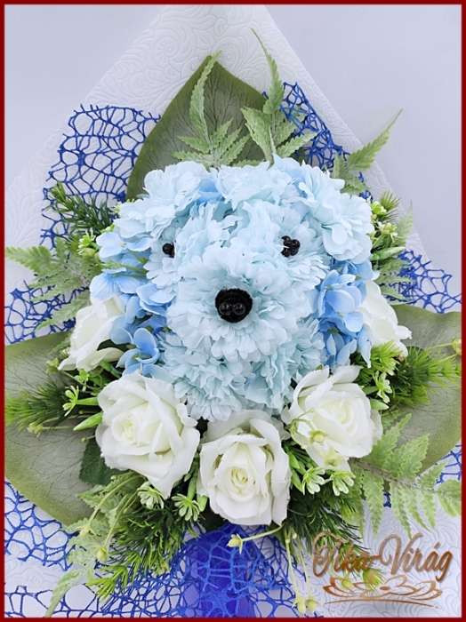 Kutyusos örök-csokor 140929. Csokor mérete: magassága: 45 cm szélessége: 30 cm Egy különleges formájú örök-csokor, amiből egy kutyus fej kandikál ki. Ezt a csokrot ajánlom bármely köszöntésre vagy ballagásra.