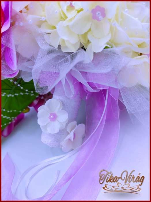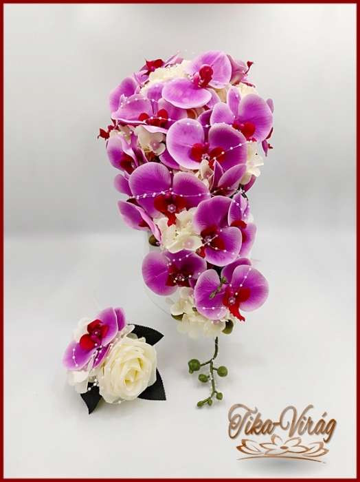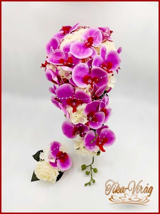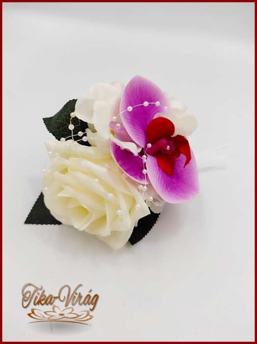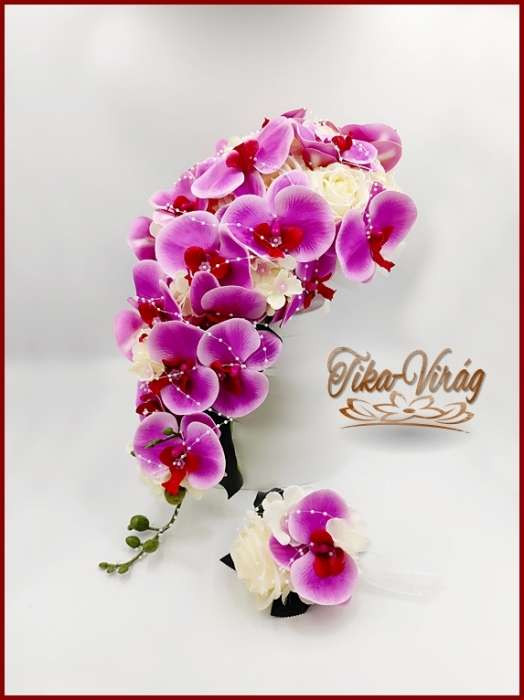 Lila orchideás - fehér rózsás örök-csokor + kitűző 191600. Mérete: 60cm hosszú , 32 cm széles Más színben is kérhető! Prémium minőségű virágokból készült örök-csokor!