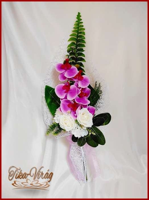 Lila orchideás - fehér rózsás örök szülőköszöntő csokor 142352. Csokor méretei: -magassága: 60cm -szélessége: 30cm Rendelhető más színben és színdíszítésben is!