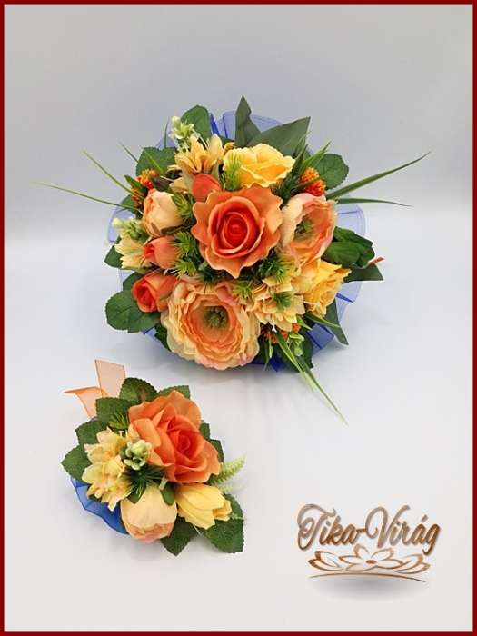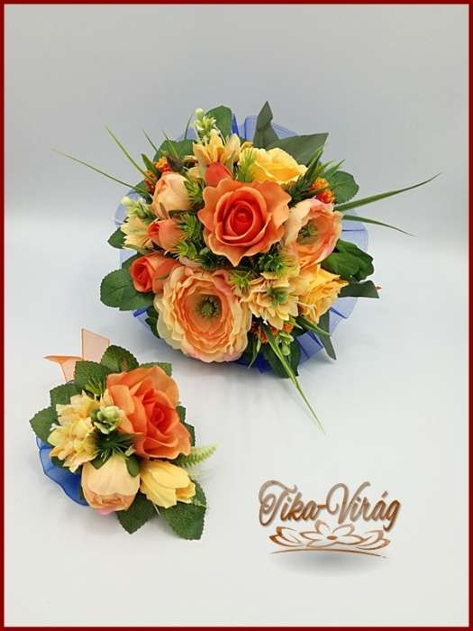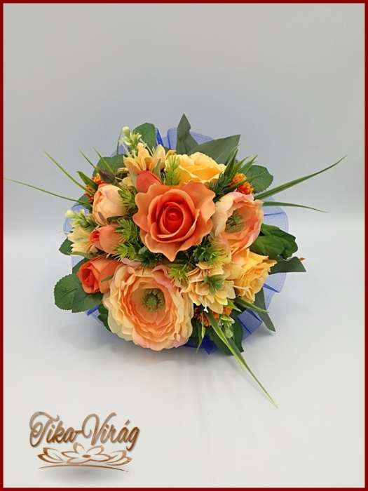 NARANCSOS RÓZSA-ÖRÖK CSOKOR, SZELLŐRÓZSÁVAL ÉS LIZIANTUSSZAL + kitűzővel 180028.