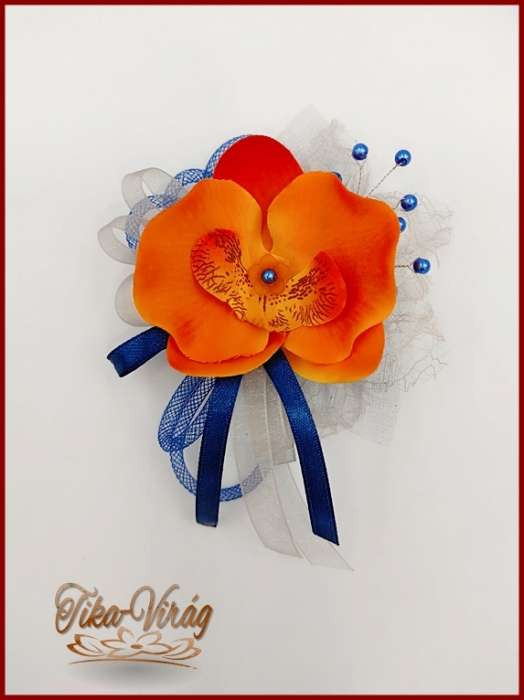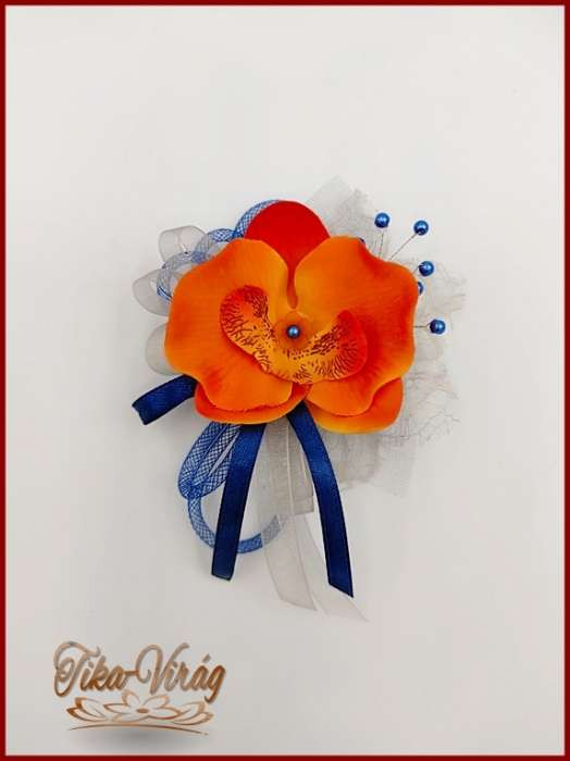Narancssárga orchidea ezüst és párizskék díszítésű női kitűző 143047.