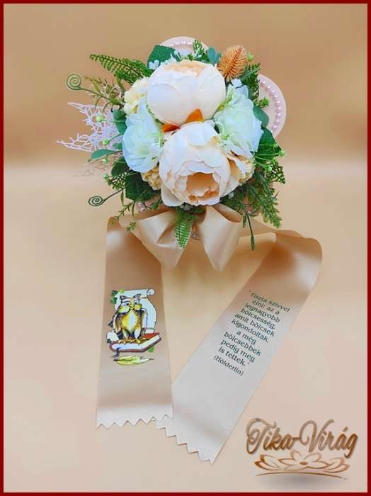 Barackos -bézs színvilágú virág formára készült egyedi ballagási csokornak készült hozzá illő ballagó szalaggal.