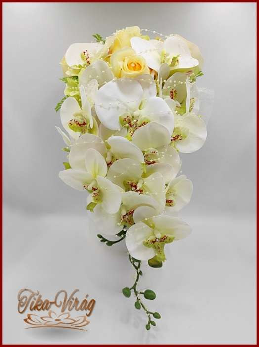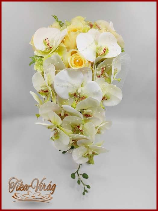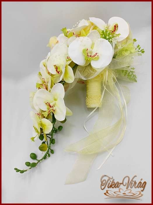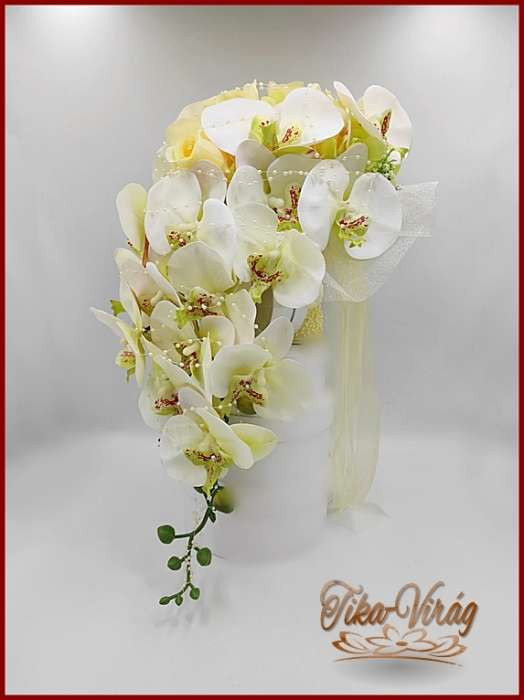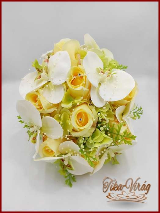 Pasztell sárga rózsás - zöldes-fehér orchideás - zöld hortenziával díszített menyasszonyi örök-csokor 133036.