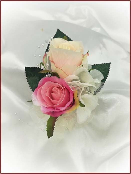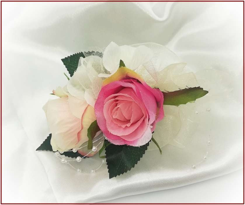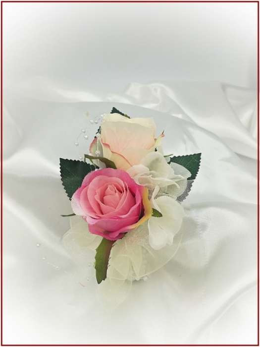 Pink-barack-pasztell 2 virágos kitűző, bokréta