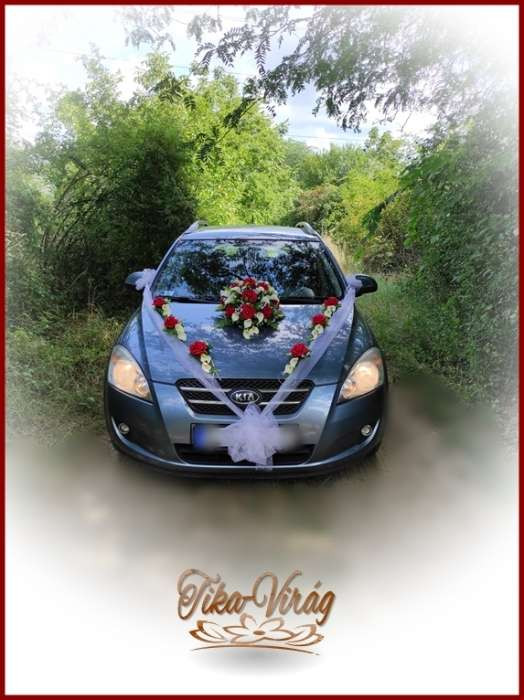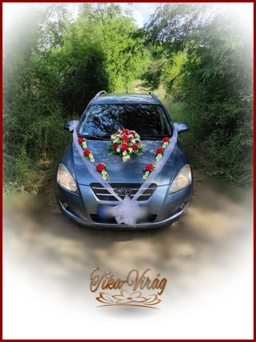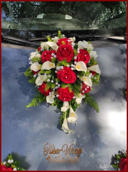 Piros rózsás-fehér kálás autódísz- fehér organza díszítéssel 114100.