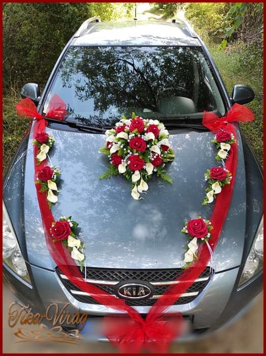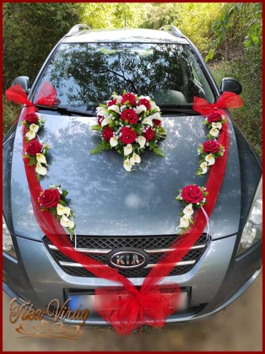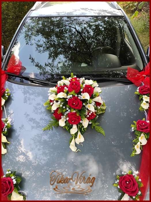 Piros rózsás-fehér kálás autódísz- piros organza díszítéssel 114909.