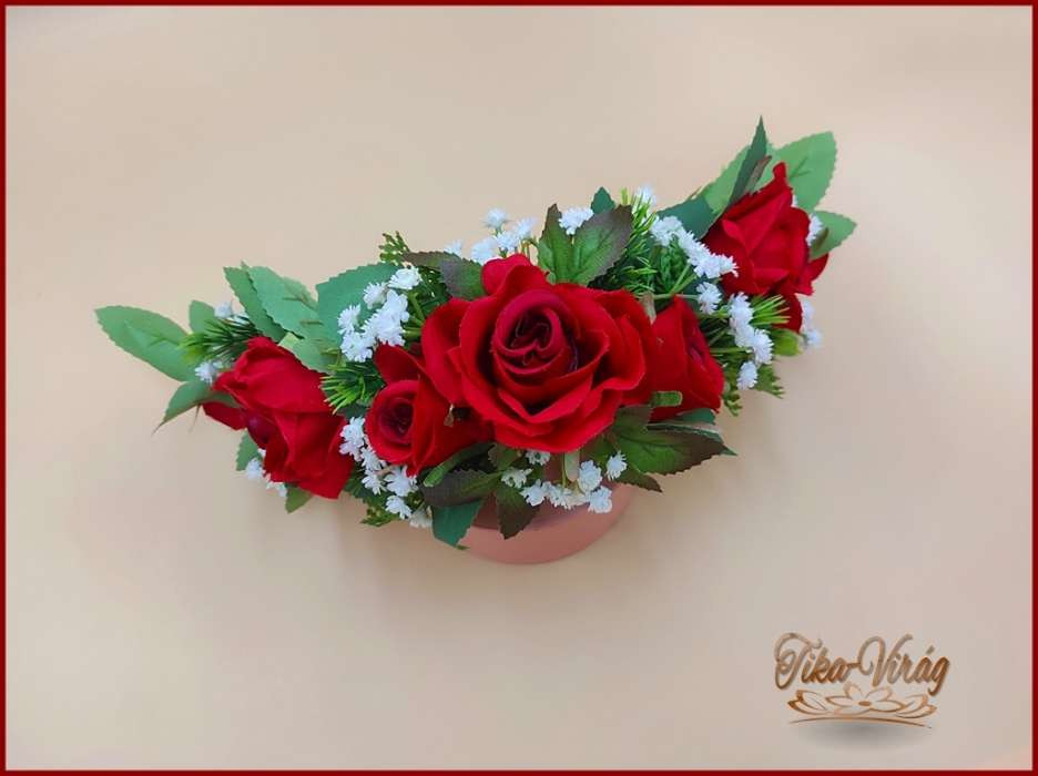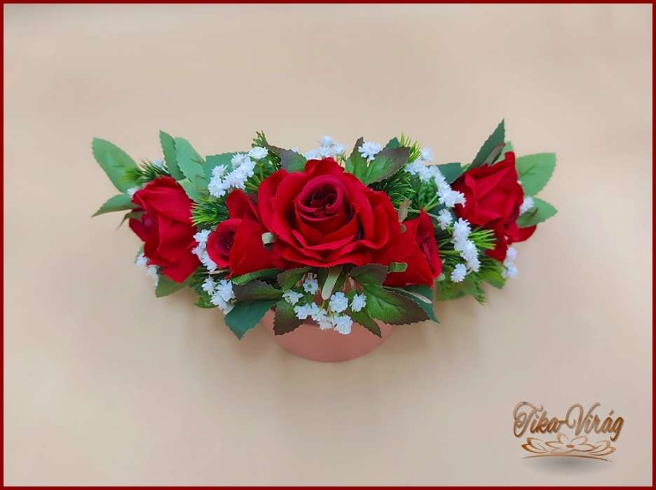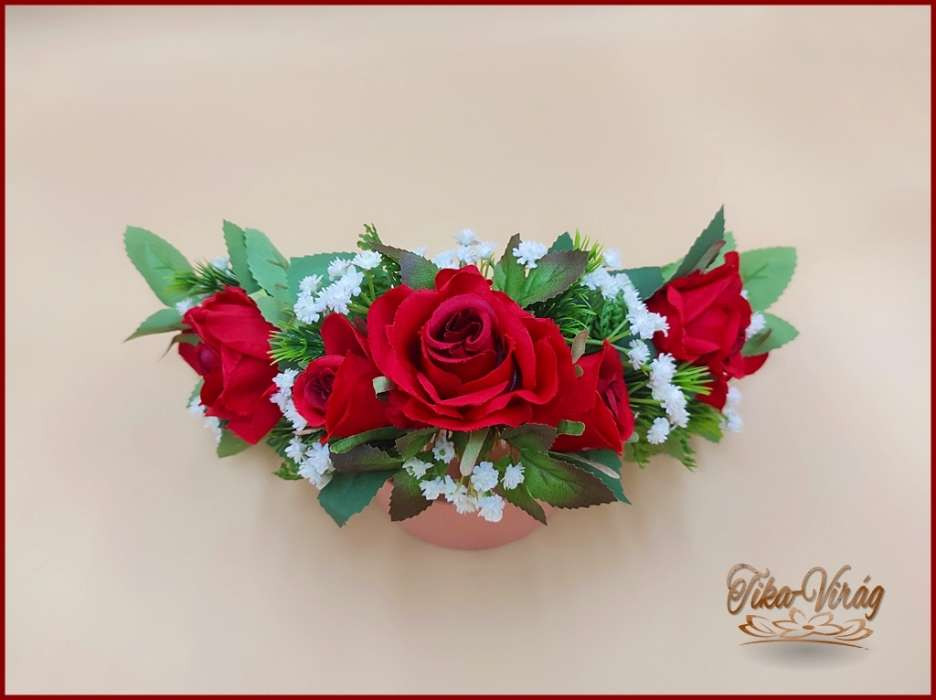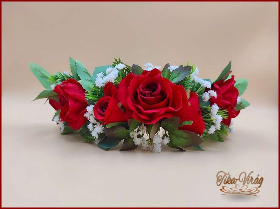 Piros rózsás - fehér rezgőkkel díszített koszorú.
