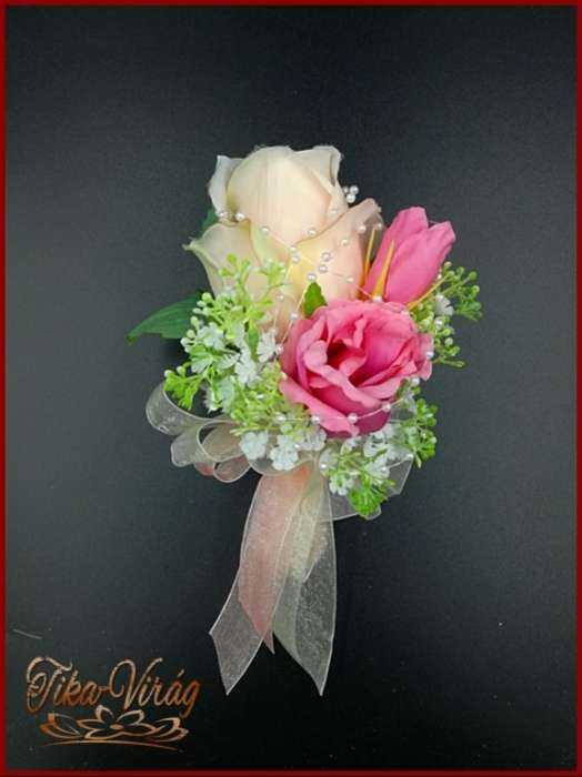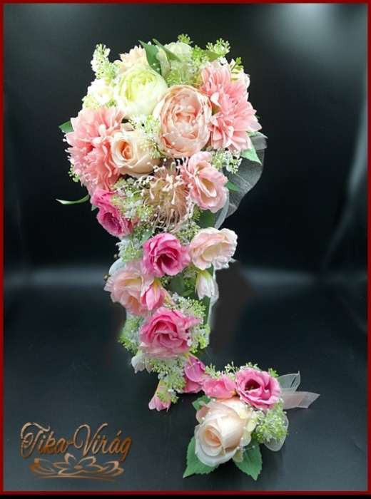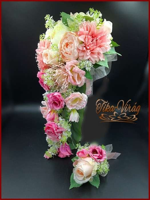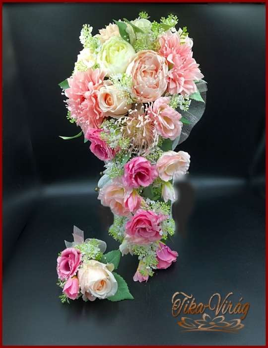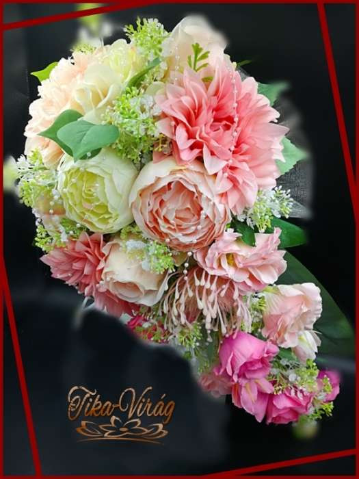 Púder-ekrü-rózsaszín örök-csokor rózsákkal, paeoniaval liziantuszaszal és dáliával + kitűzővel 143108.
