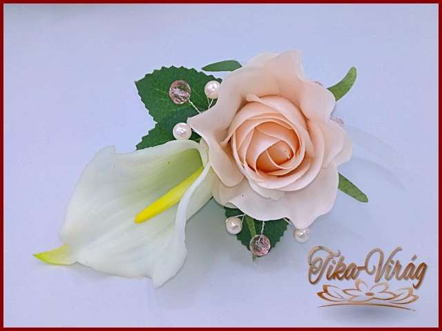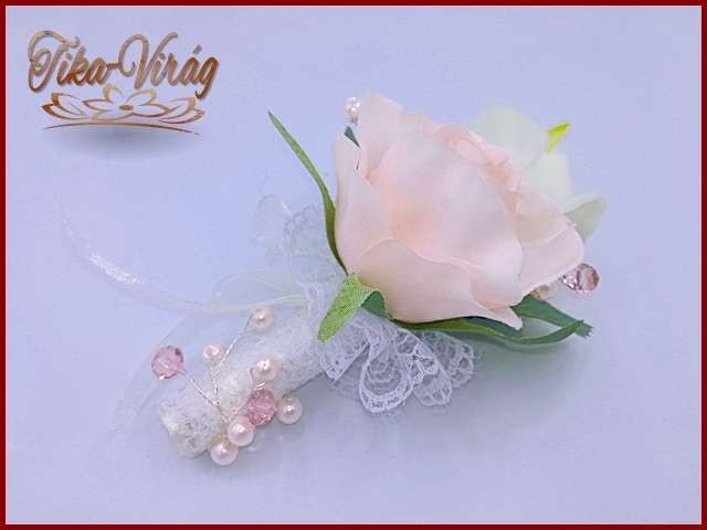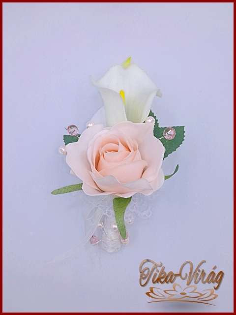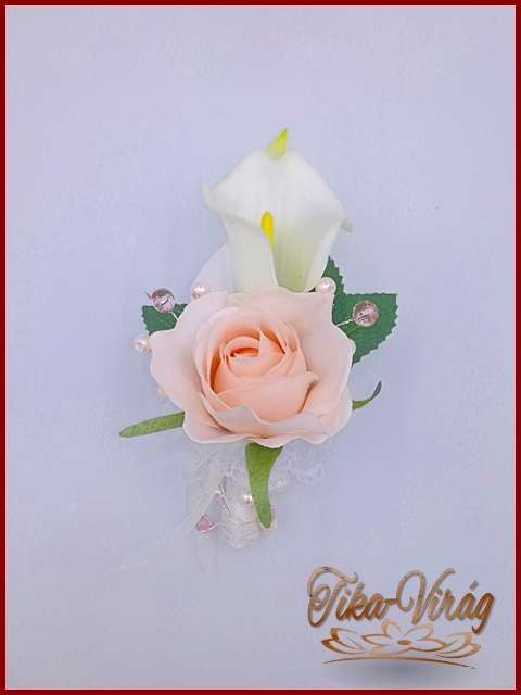 Púder-rózsaszín rózsás-fehér kálás kitűző, bokréta