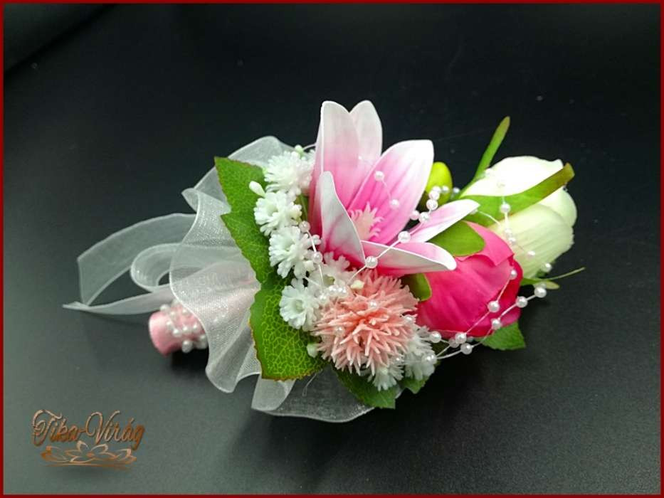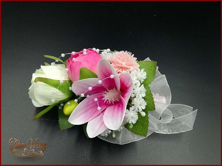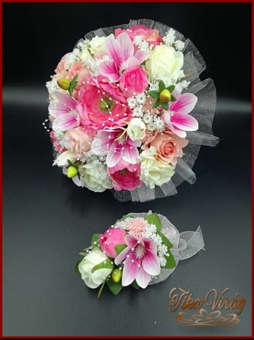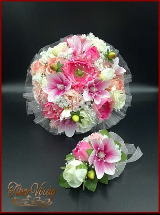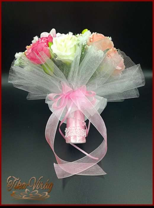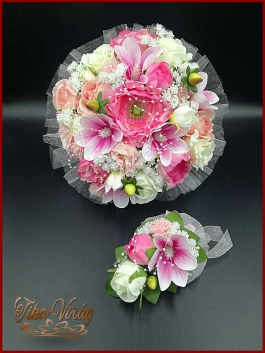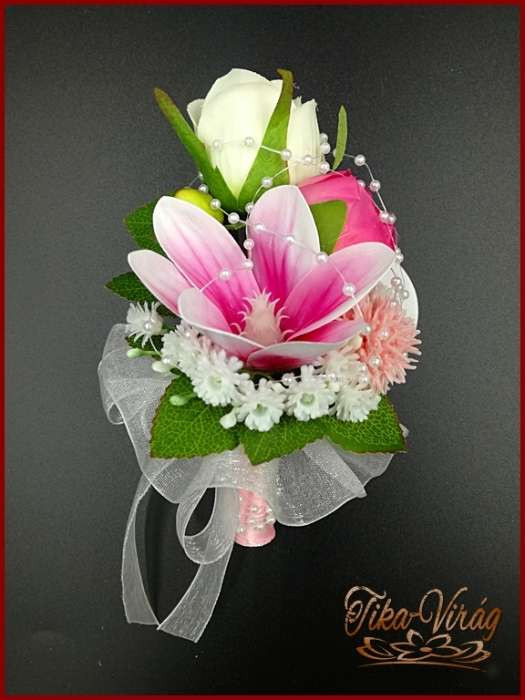 RÓZSASZÍN SZELLŐRÓZSÁS-FEHÉR RÓZSÁKKAL, LIZIANTUSZOS ÖRÖK-CSOKOR+kitűzővel 122620.