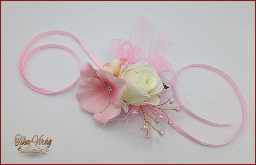 Rózsaszín-fehér rózsás-hortenziás csuklódísz