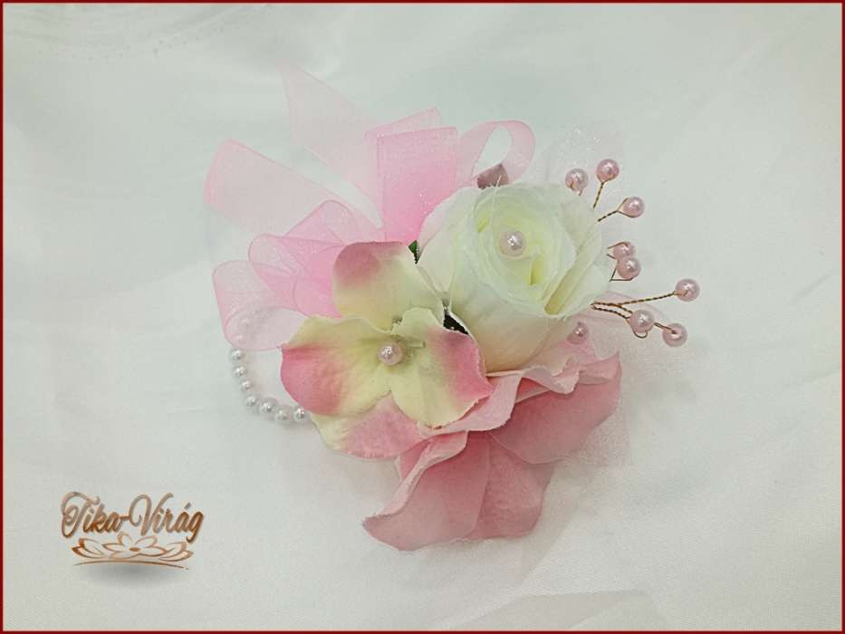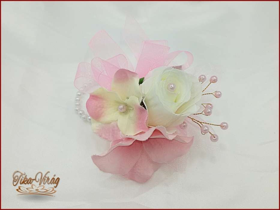 Rózsaszín-fehér rózsás-hortenziás csuklódísz gyöngysoron
